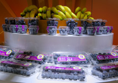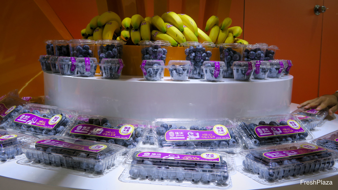 在佳沃鑫荣懋展柜,展示新鲜的蓝莓和香蕉。/ Fresh blueberries and bananas on display under the Joy Wing Mau Joyvio brand.