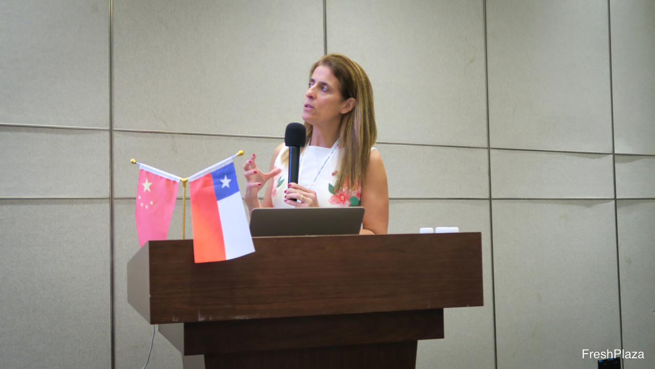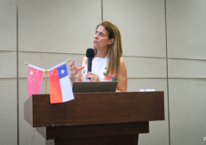 展会第二天,从“智利樱桃,中国市场”研讨会开始,该研讨会由ASOEX(智利水果出口商协会)组织。图为ASOEX的行政总监Claudia Soler。ASOEX希望通过在二三线城市等更多地区进行推广,培育潜在消费群体,以增加中国市场对智利车厘子的消费量。/ The second day of the show started with a "Chile Cherry Market" market presentation organized and hosted by ASOEX. On the photo is Claudia Soler, Executive Director. ASOEX wants to strengthen cherry consumption in China, with a major push into new, tier 2 and 3, cities, and growing the consumer target group.