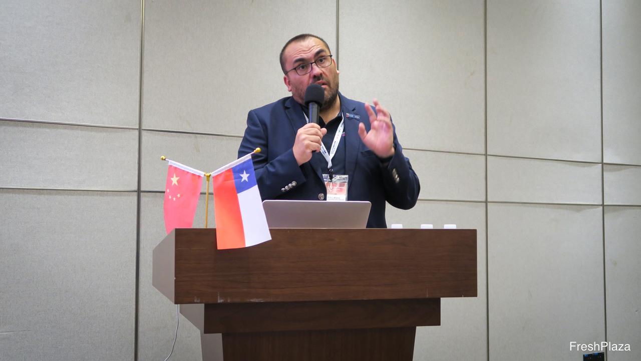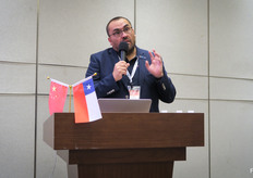 展会第二天,从“智利樱桃,中国市场”研讨会开始,该研讨会由ASOEX(智利水果出口商协会)组织。图为欧洲与亚洲市场总监Charif Christian Carvajal。智利车厘子产量预计将在未来四年内翻倍。/ The second day of the show started with a "Chile Cherry Market" market presentation organized and hosted by ASOEX. On the photo is Charif Christian Carvajal, MArketing Director for Asia and Europe. Chile's cherry production is expected to double in the next four years.