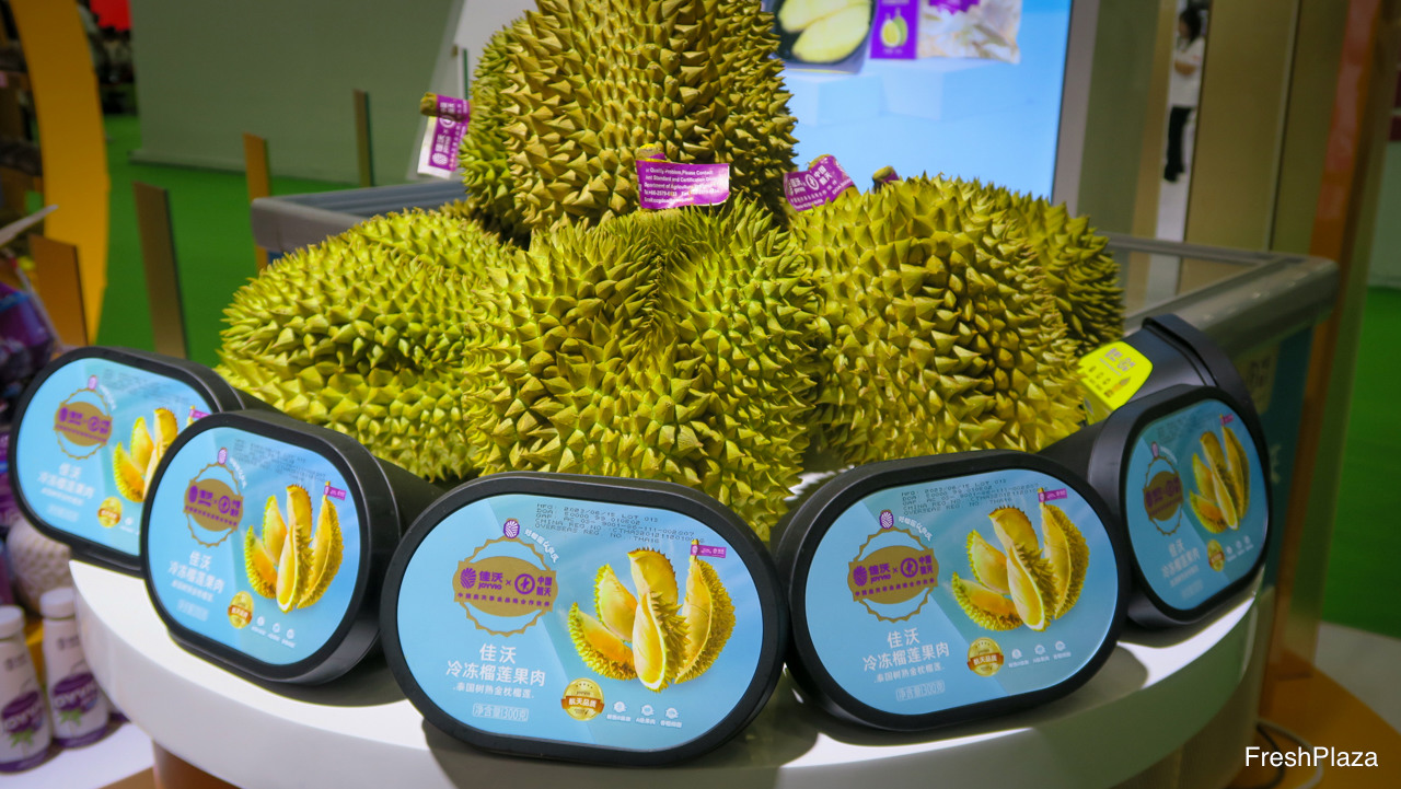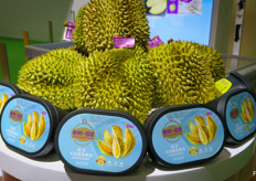 佳沃鑫荣懋展柜,展示出榴莲。/ Durian on display under the Joy Wing Mau Joyvio brand.