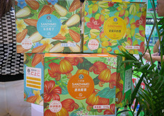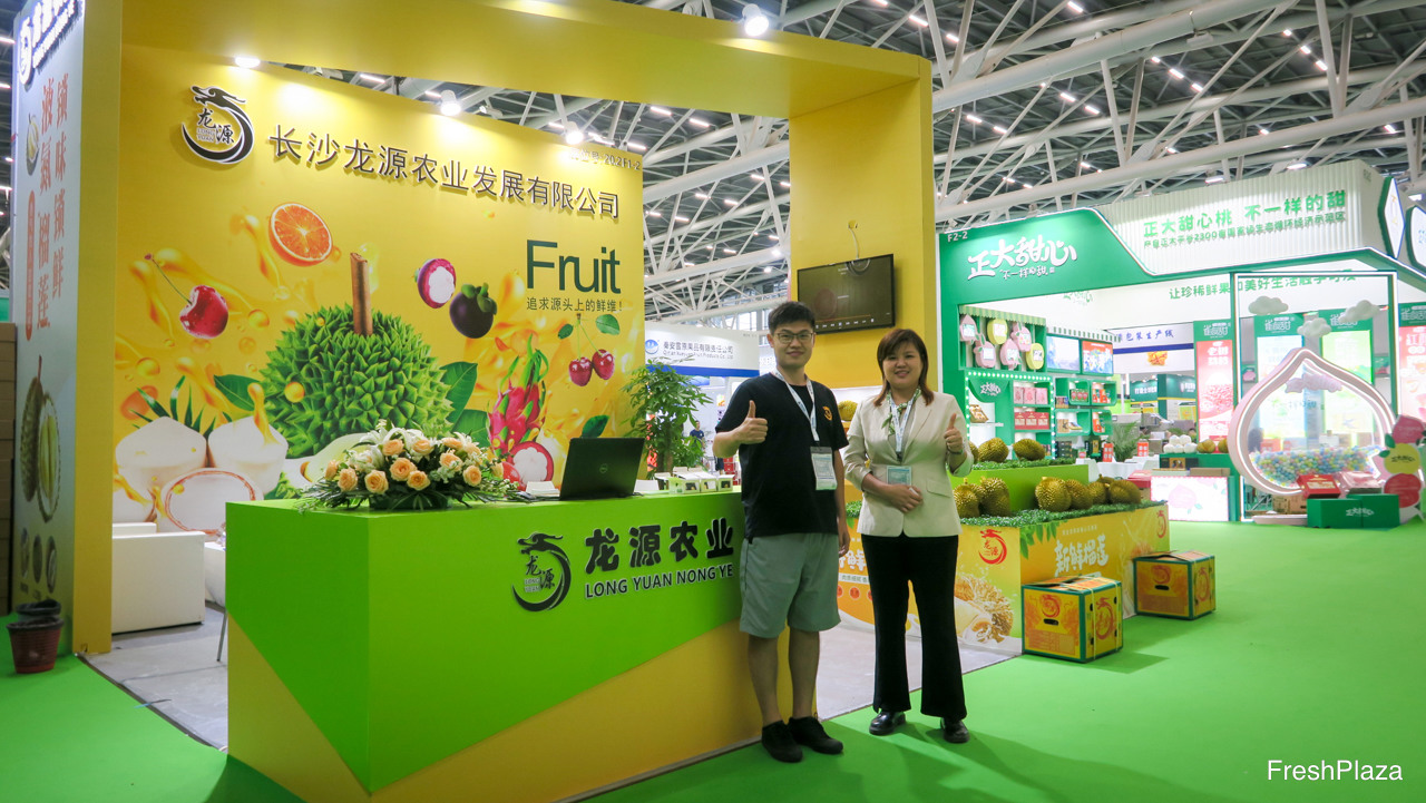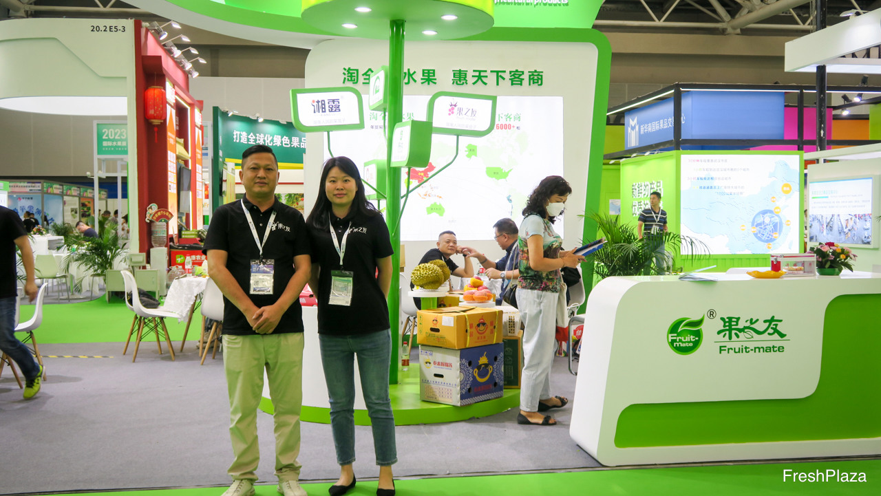 果之友位于湖南长沙,是一家大型进口水果批发商,在嘉兴等批发市场拥有档口。公司经营自有品牌的榴莲。除进口水果业务以外,公司还种植葡萄。图中是符灿女士。/ Fruit-Mate is a company from Hunan specialising in import fruits for wholesale distribution and retail supply. Also have presence at major wholesale markets including JiaXing. The company has its own brand in durian. In addition to import, the company grows grapes. In the photo is Elena.