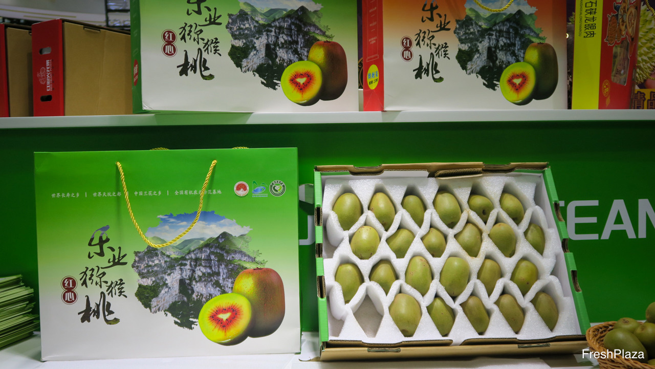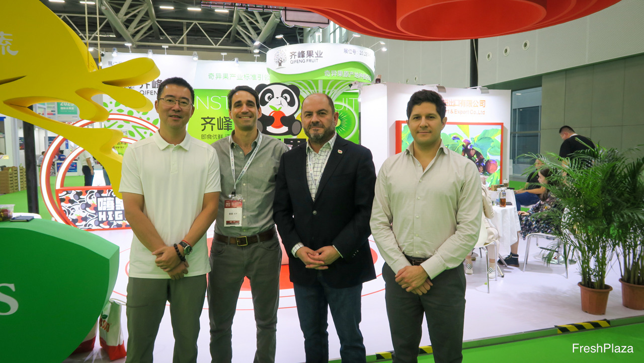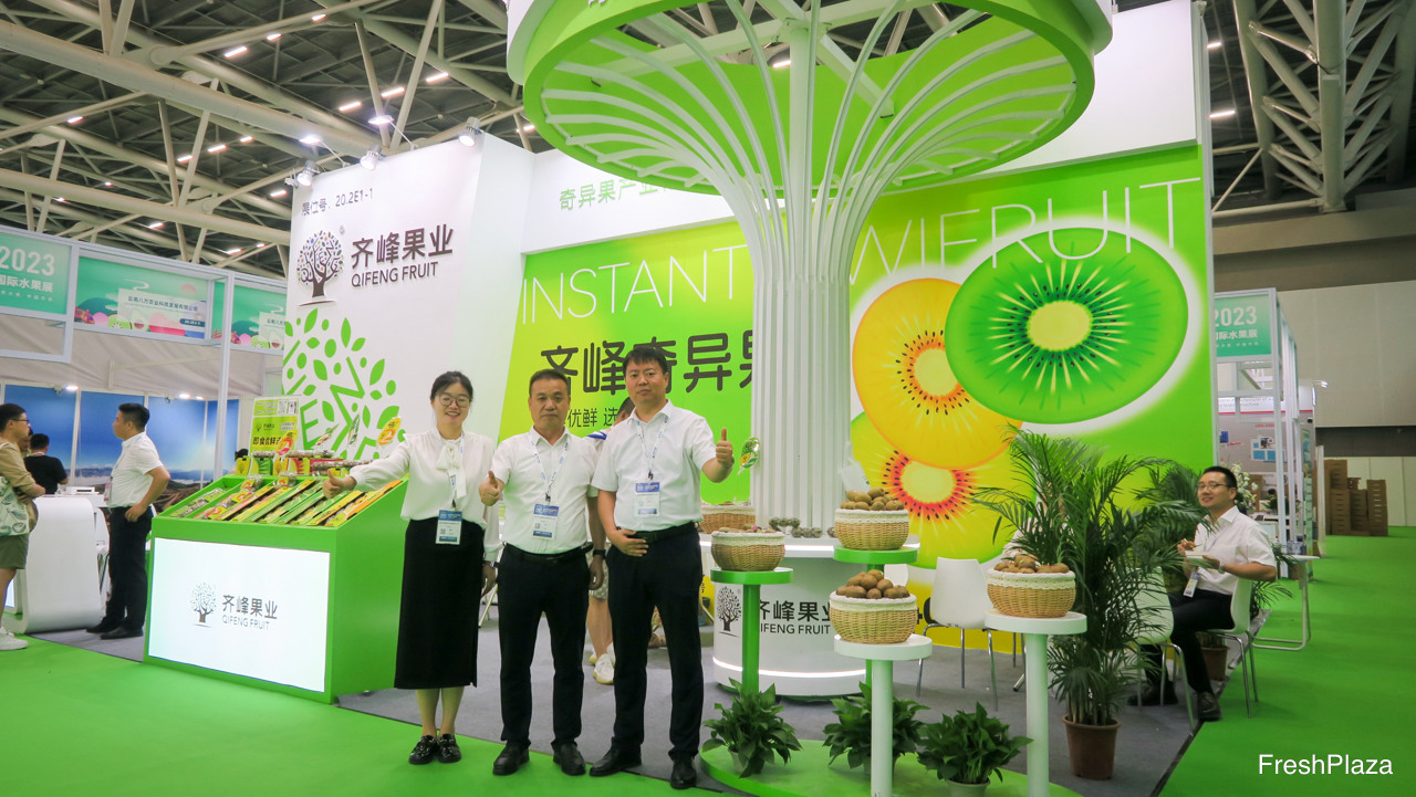 齐峰果业是一家位于陕西的猕猴桃种植与销售企业。猕猴桃新产季即将开启。公司近年致力于即食猕猴桃的发展,并已在商超进行销售。该项目将增强猕猴桃的销售。图中最右边为鲁文博。/ Qifeng Fruit is a kiwifruit grower and distributor from Shanxi. The new kiwifruit season is about to start. One of the latest developments are the sales of ready-to-eat and ripe kiwifruit, which is available in supermarkest. This will enhance the sales of kiwifruit. On the photo to the right is Bruce Lu.