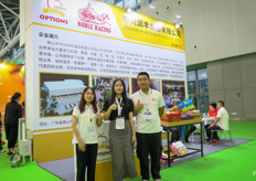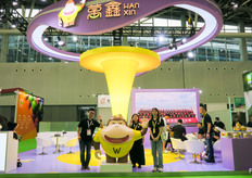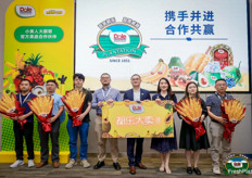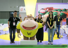广东万鑫农业科技发展有限公司及公司吉祥物。该公司经营进口水果及国内精品水果,在广州的批发市场拥有档口。照片上是温秋顺、Hadi Chen、李逸媚和冼仲荣。/ Guangdong Wanxin Agricultural Science and Technology Development Company with the company's mascotte. The company is not only a fruit importer, but is also trading in domestic fruits, with the sales in wholesale market in GuangZhou. On the photo are Rachel Wen, Hadi Chen, Fiona Li and Erik Xian.