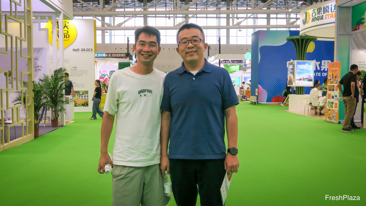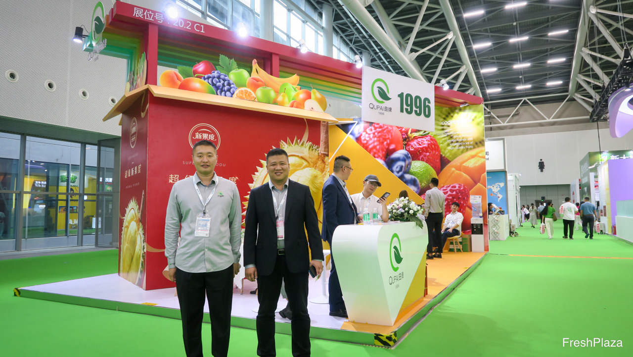 曲牌果业以“新果度”为品牌经营进口水果。主营产品为泰国榴莲及智利车厘子。图为国际采购洪泽旭,及采购经理肖洋。/ Qupai Fruit trades imported fruits under its XinGuoDo brand. Major products are Thai durian and Chilean cherries. On the photo are Allen Hong, Global Purchaser, and Eric Xiao, Purchase Manager.
