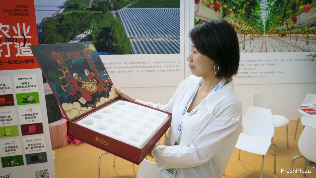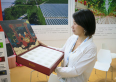 Imei Max, 东港市原乡草莓专业合作社,来自杭州的草莓种植及品牌策划企业。图为张佳女士,捧着公司设计的草莓礼盒。/ Imei Max, branding company and strawberry grower from HangZhou. On the photo is Zhang Jia. She is holding a box created for strawberries as a gift box.