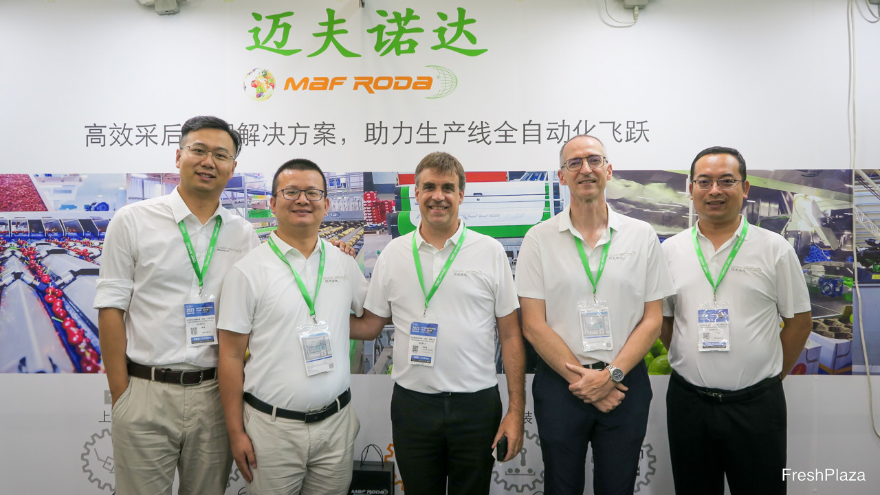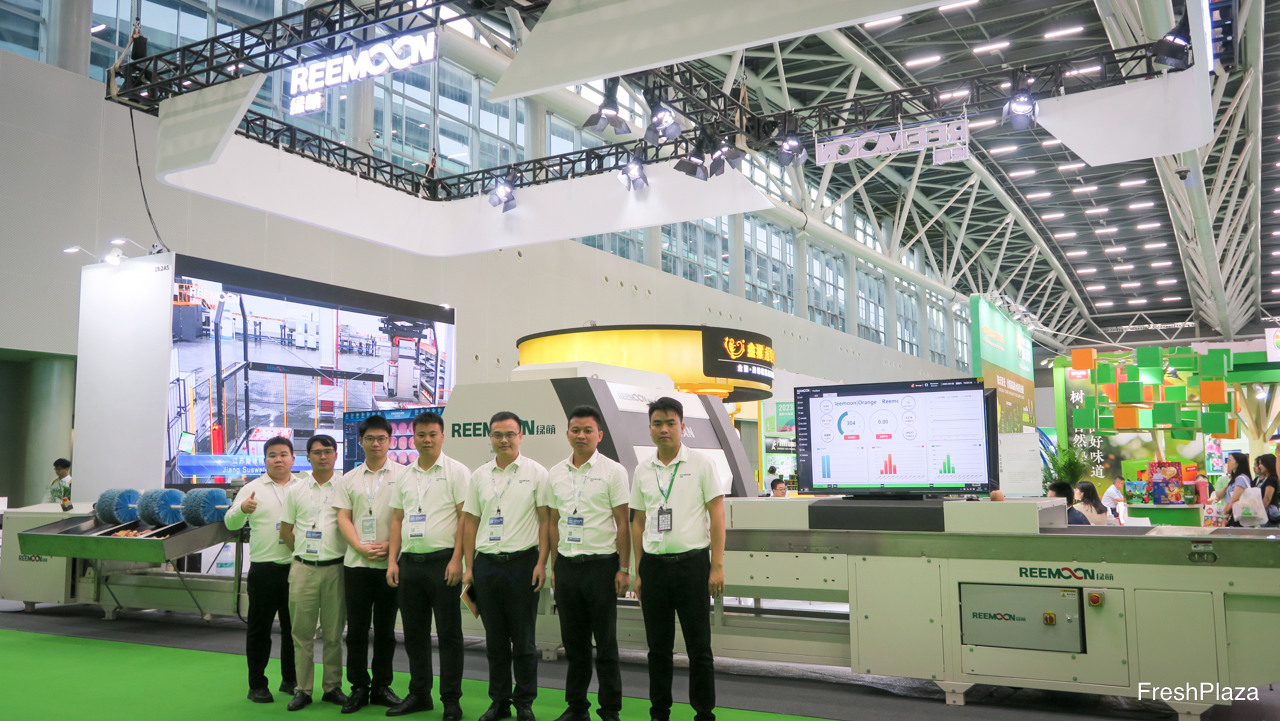 绿萌团队在公司最新的 Fruscan S7 Pro 分选机前。过去几年,该公司在国际上快速扩张,目前已在澳大利亚、印度、南非、智利和墨西哥安装了生产线。/ Reemoon's team in front of the company's latest Fruscan S7 Pro sorting machine. The company has been expanding fast internationally over the last few years, with now lines installed in Australia, India, South Africa, Chile and Mexico.