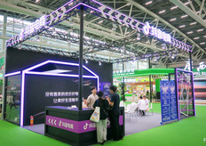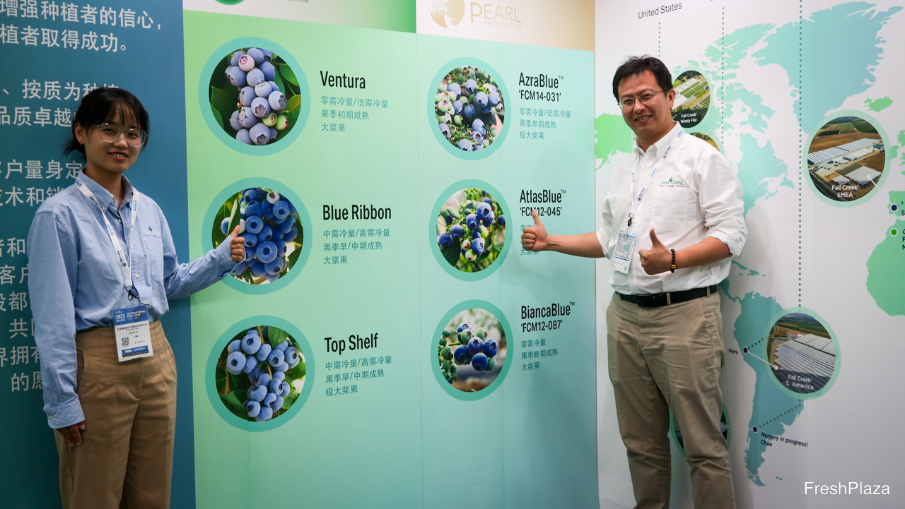 富瑞科(Fall Creek China)借此次展会为契机,向中国市场的种植者宣布,富瑞科专利蓝莓种苗已经在中国投入生产和开始交付。中国蓝莓产业亟待优质新品种,在北高和南高专利品种上富瑞科看到了巨大的市场潜力。图为尹春杨。/ Fall Creek China takes this exhibition as an opportunity to inform the blueberry producers in China that it started the production and delivery of blueberry young plants of its proprietary varieties. As the Chinese blueberry industry is in need of new genetics, Fall Creek China sees high potential for both its Northern and Southern Highbush proprietary varieties in this market. On the photo is Yin.