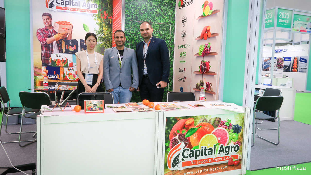 Capital Agro是一家埃及柑橘种植商,向中国市场销售产品,图为Kelly, Ibrahim Said 及市场部经理Tamer Magdy. / Capital Agro is an Egyptian citrus grower. The company supplies the Chinese market. On the photo are Kelly, Ibrahim Said and Tamer Magdy, Marketing Manager.