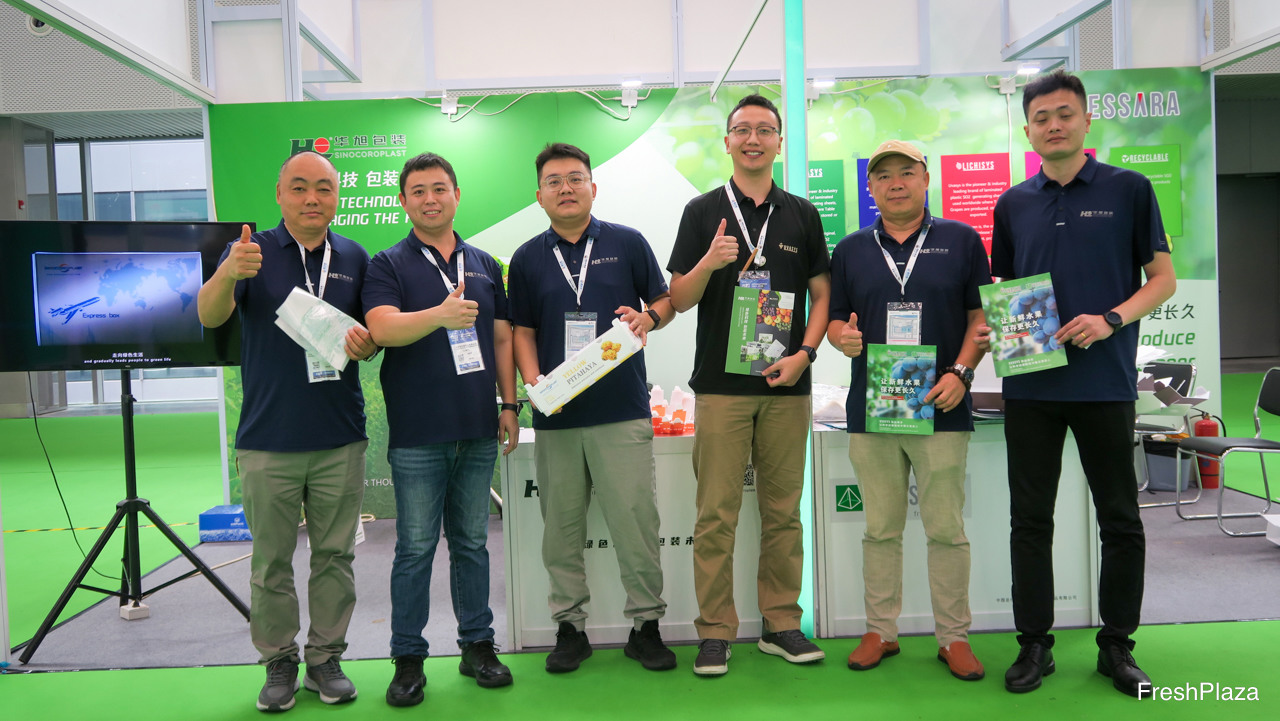 华旭包装为水果行业生产耐水型塑料包装。图片中间为高级销售经理李跃龙。/ Sinocoroplast produces plastic packaging that can withstand water for the fruit industry. In the middle of the photo is Niklaus Li, Senior Sales Manager.
