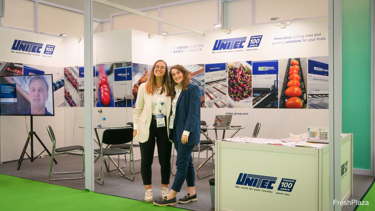 Unitec提供分选线与分级解决方案。公司通过北京的合作伙伴在中国经营业务,并希望扩展市场份额。图片是Laura Vignoli 和 Mariantonietta D'aversa。/ Unitec is a developer of sorting lines and grading solutions. The company is present in China through a dealer partnership in Beijing, and is eager to grow its presence. On the photo are Laura Vignoli and Mariantonietta D'aversa.