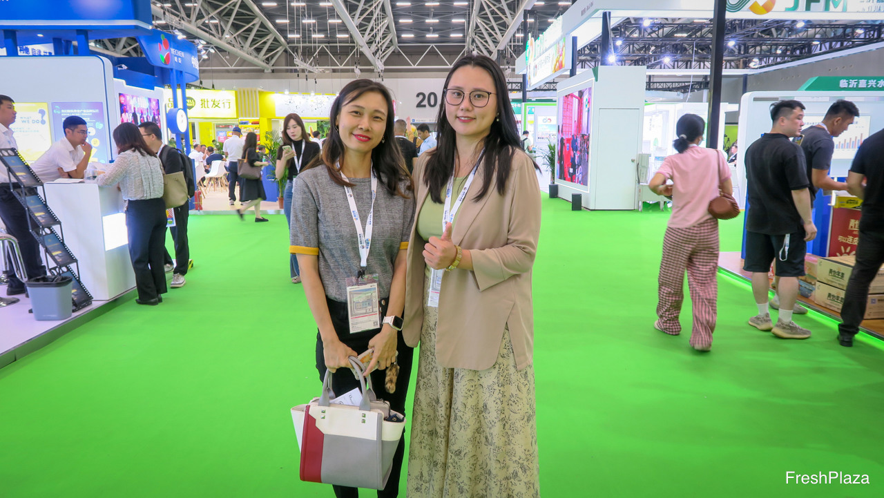 左边是FRECO Fresh的总经理Jade Shan, 公司主营新鲜和冷冻的波罗蜜,在中国国内可供全年销售。另一位是来自柏林展览广州办公室的Gloria Guan, 柏林展览是国际大型展会主办方。/ Jade Shan, to the left, is the General Manager at FRECO Fresh. The company specialises in fresh and frozen jackfruit, available year-round across China. She is together with Gloria Guan from Messe Berlin Guangzhou, Messe Berlin is an organizer of International exhibitions.