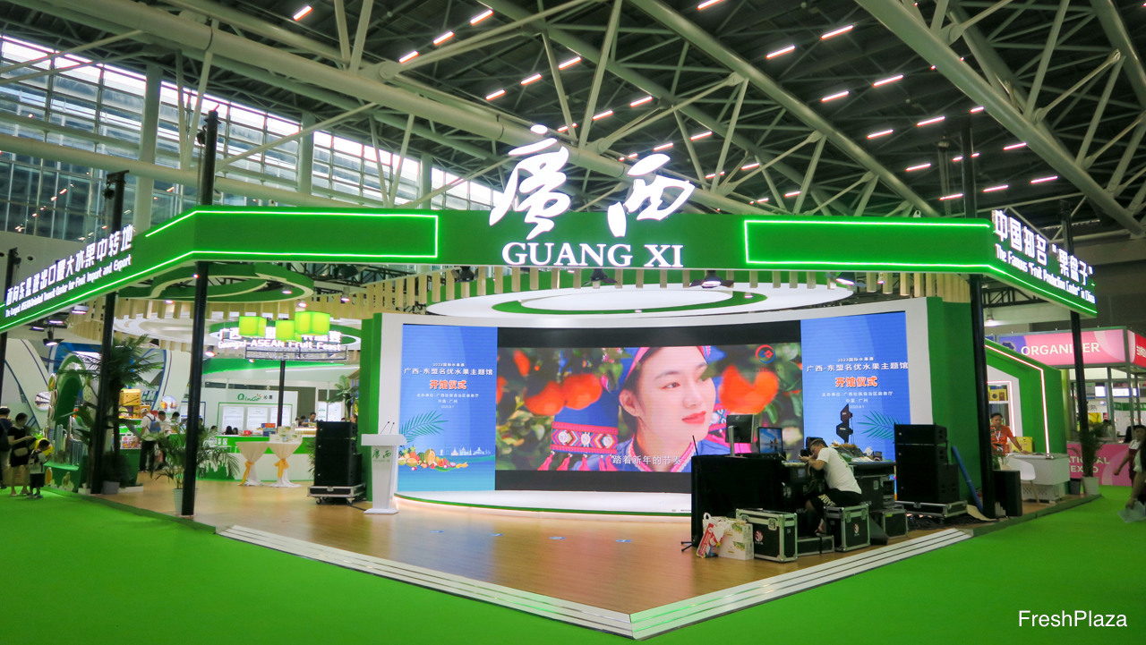 广西水果展区为当地水果作推广。展区包含不同的种植商及销售企业。/ The Guanxi pavillion, promoting fruits from the region. The pavillion combines different growers and shippers with their products.