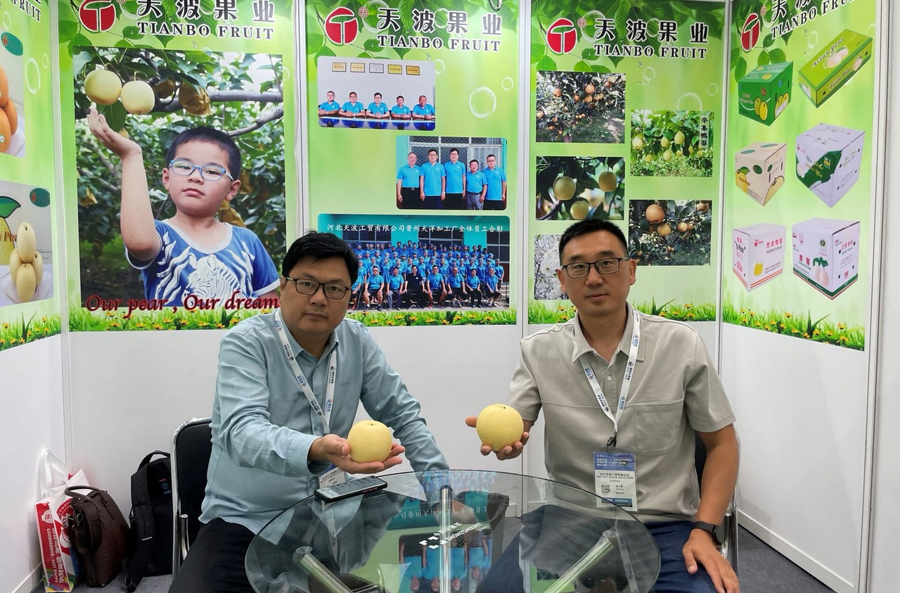 河北天波果业的边庆刚和Leo。公司专注于河北梨的生产和出口 // Gavin Bian and Leo from Hebei TianBo Industry. The Group specialises in Chinese pear production and exports, all from Hebei province.