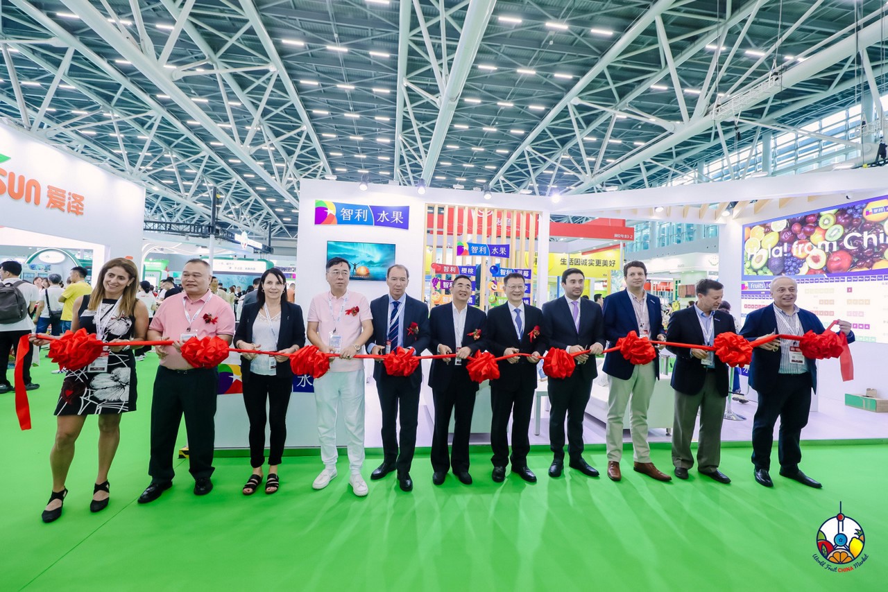 在中国广州举行的2023国际水果展会上,智利水果展台揭幕。代表机构包括智利水果出口商协会(ASOEX)、中国食品土畜进出口商会(CFNA)、中国水果流通协会(CFMA)、广州江南批发市场、嘉兴批发市场和智利大使馆。/ Inauguration of the fruits from Chile stand at the 2023 International Fruit Expo, held in Guangzhou, China. Entities represented include, Chilean Fruit Exporters Association (ASOEX), China Chamber of Commerce of Import & Export of Foodstuffs, Native Produce & Animal By-Products (CFNA), China Fruit Marketing Association (CFMA), JNH wholesale market, Jiaxing wholesale market and the Embassy of Chile.