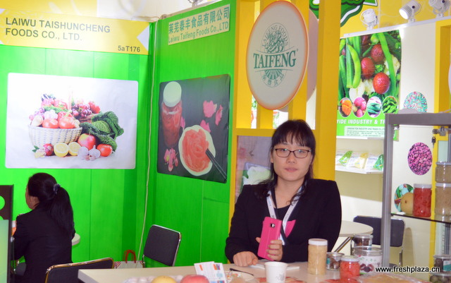 来自叁人(厦门)国际贸易有限公司的张玉凤。该公司出口冷冻水果和蔬菜,还有一些新鲜产品,包括柚子、生姜和大蒜。