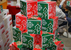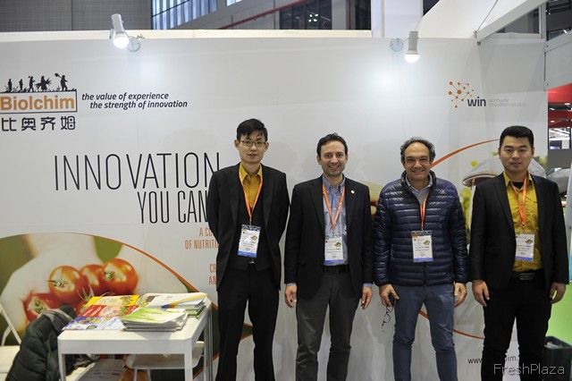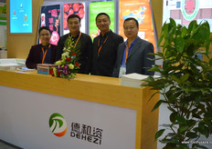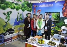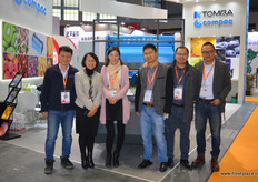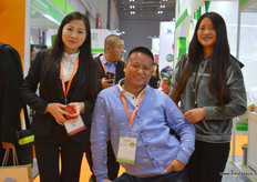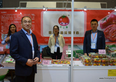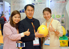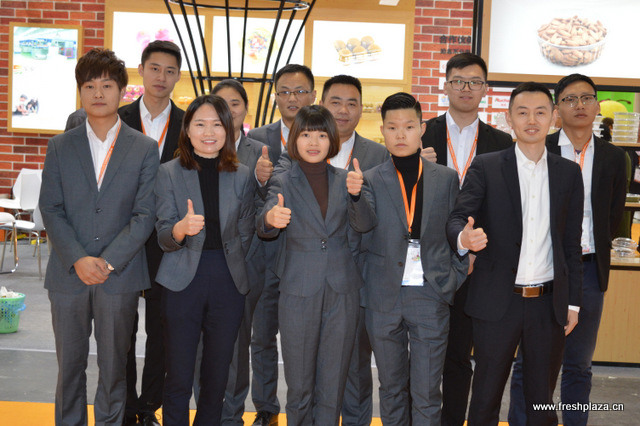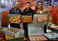 Henry Wang, in the middle, together with his team at Jiu Tai. This year Jiu Tai will market is tangerin and hami melon brands on the European market // 汪恒定(在中 间)和他的团队在久泰农业展台。今年,久泰农业将在欧洲市场上营 销其鲜橙和哈密瓜品牌