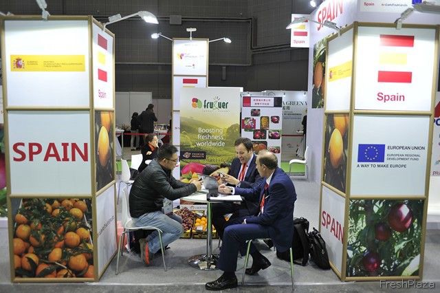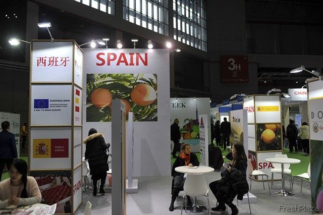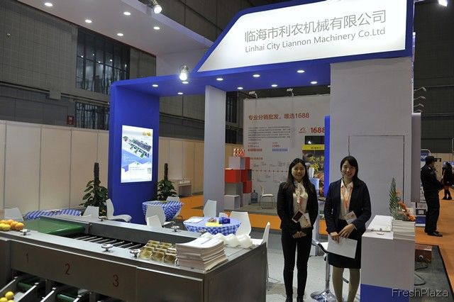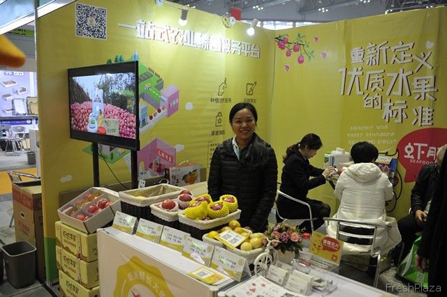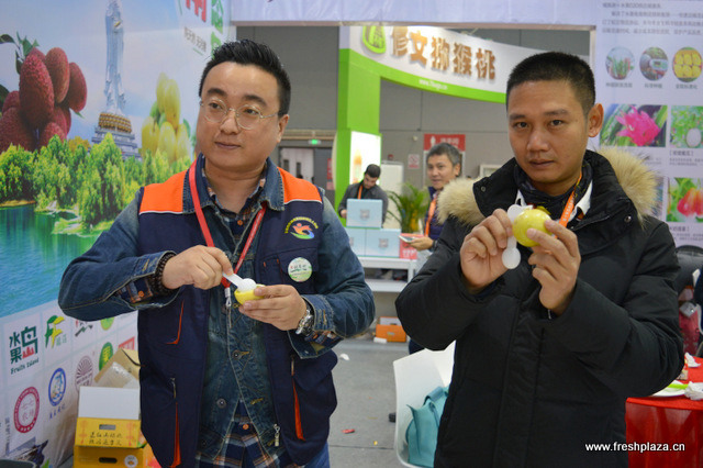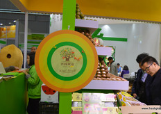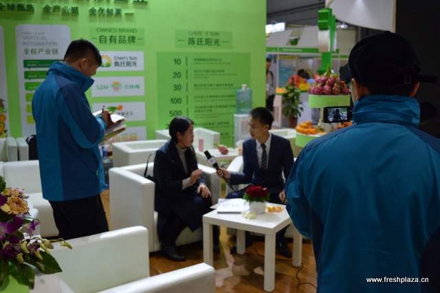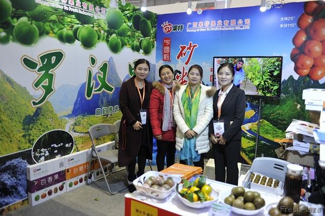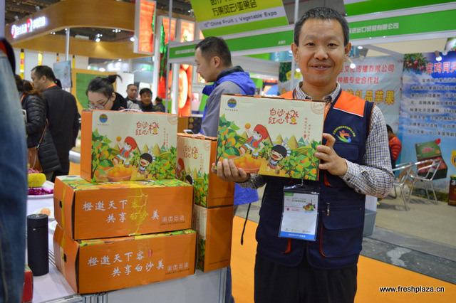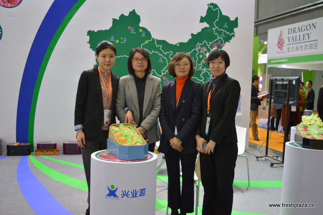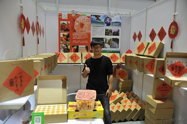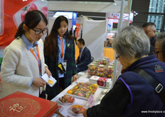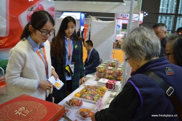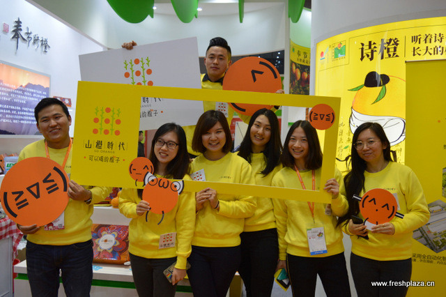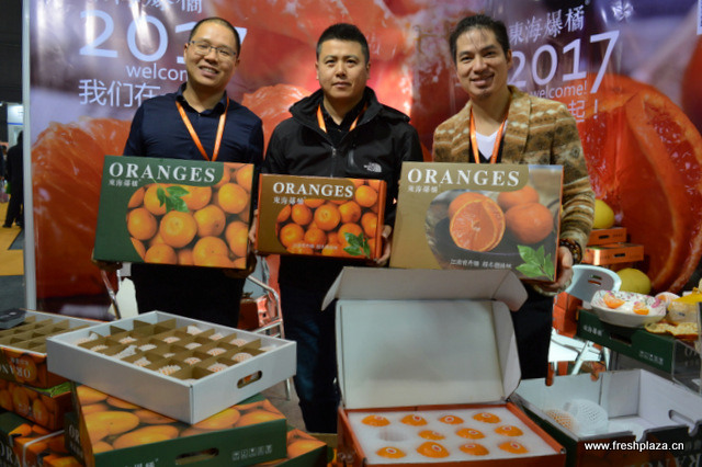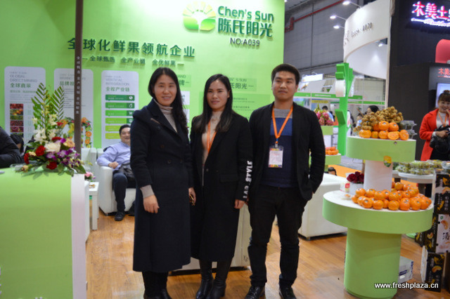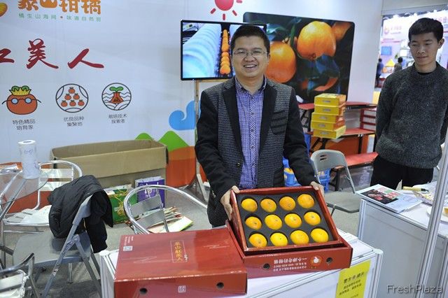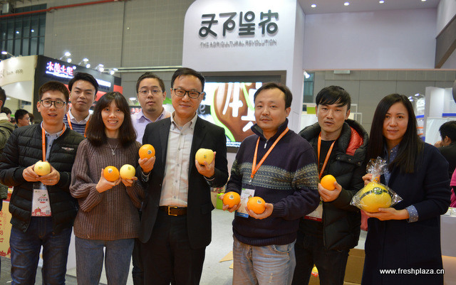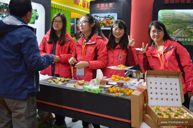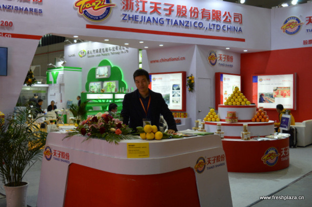 Zhejiang Tiazni Shares, a large grower and packer of Zhejiang citrus // 浙江天子股份有限公司展台,参展人员正在展 示该公司的柑橘产品。