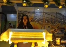 Jia Meng Yun showing one of the products // Jia Meng Yun正在 展示其产品之一