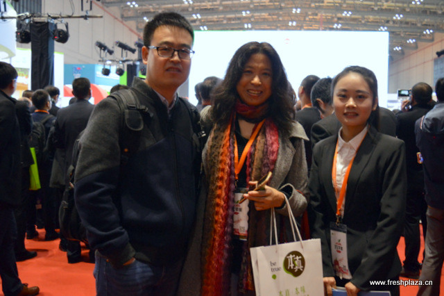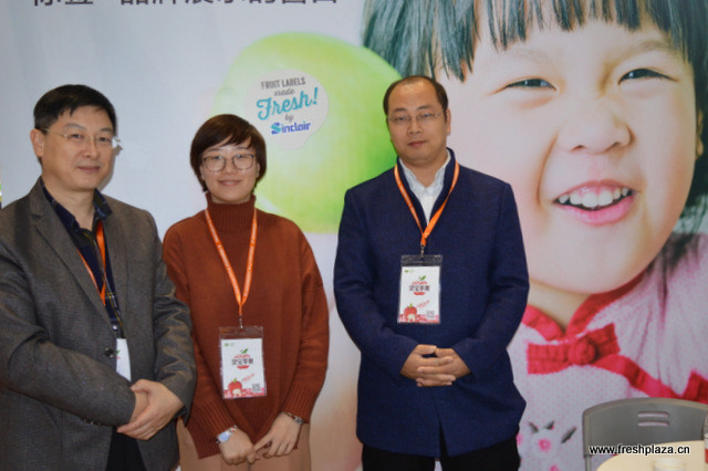 Rebecca Zhou, together with Ling Niuxian, General Manager and Ling Niuxian, General Manager of Fruitkii, a fruit sources, packer and distributor from Henan in Central China // 周杰(左),与锦州九洲国际贸易公司的总经理 牛仙玲(中)以及锦地九洲国际贸易有限公司的国际物流经理丁泽红 (右)一起,该公司是在位于中国中部的河南的一家水果采购商,加 工商和分销商