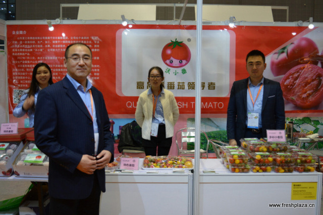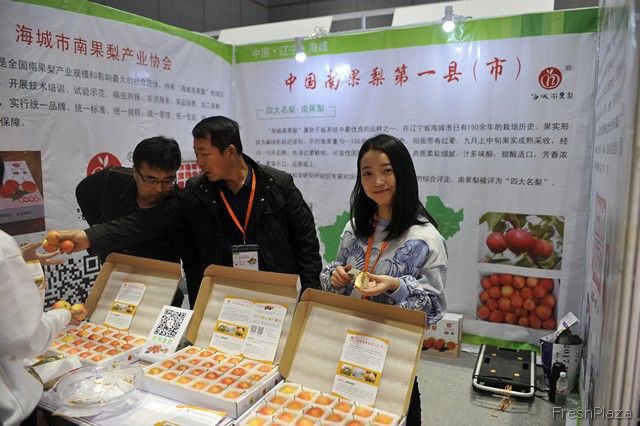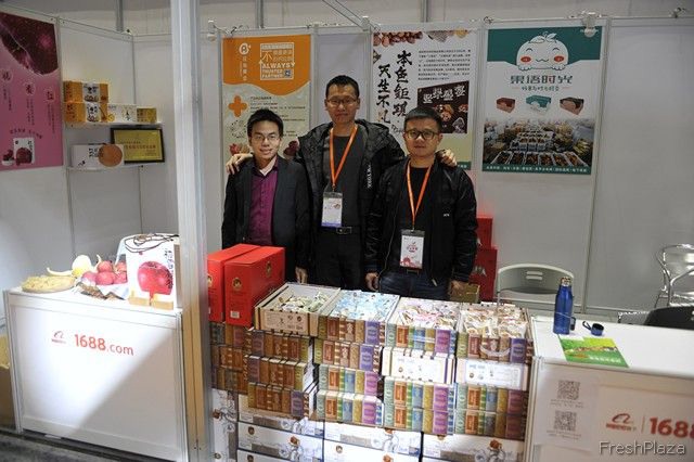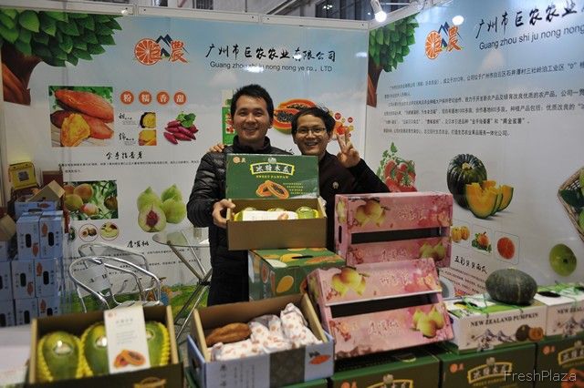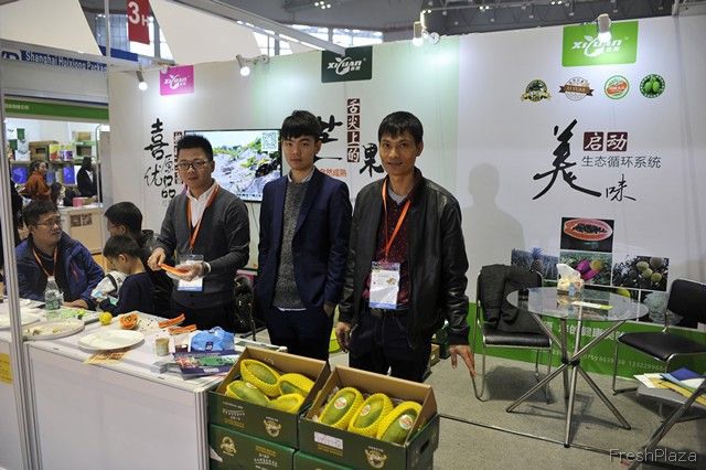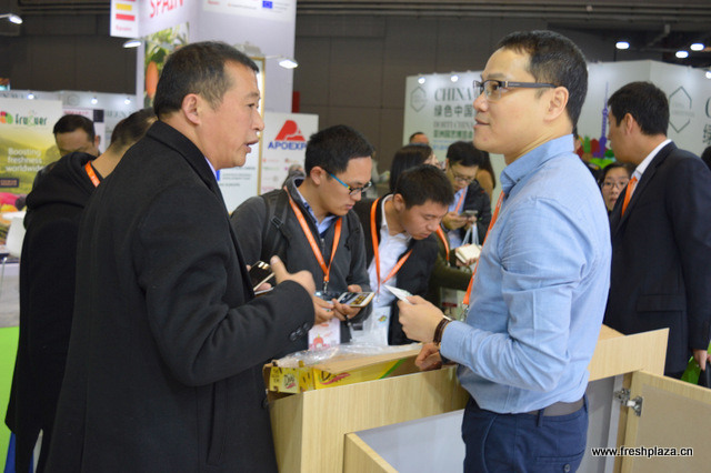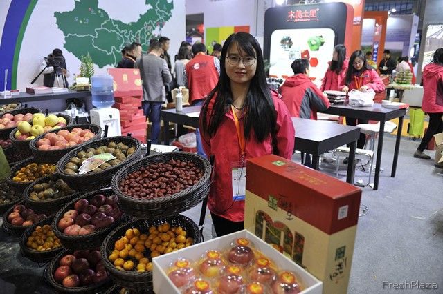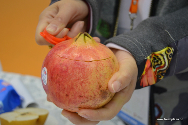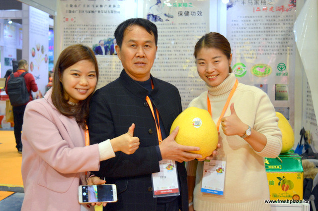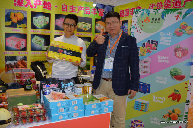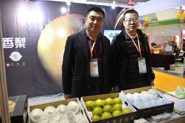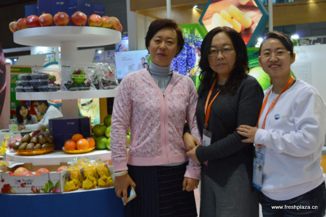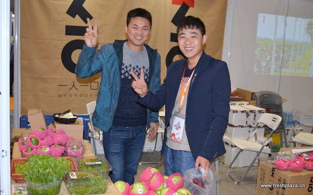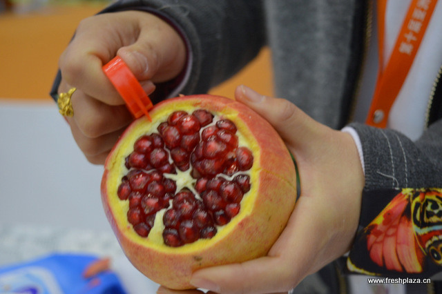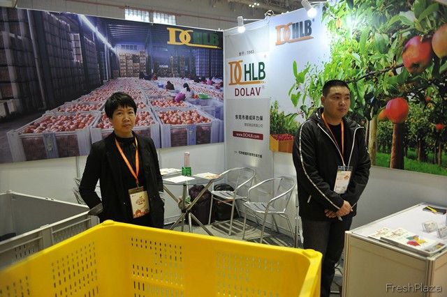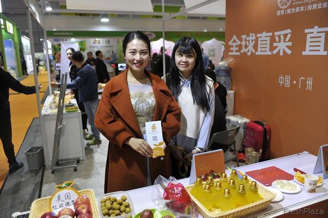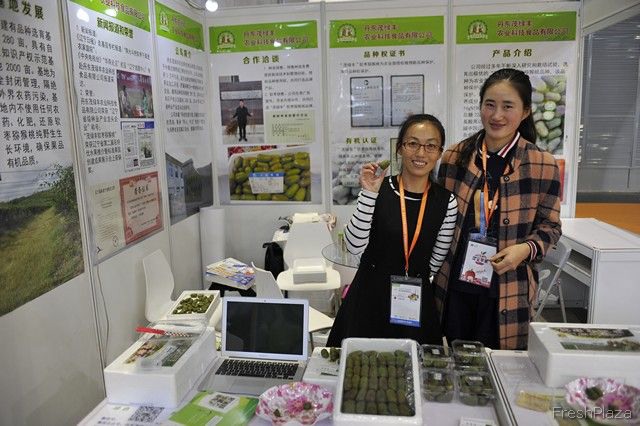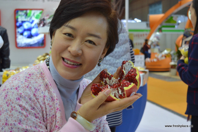 Rebecca Zhou, founder and managing director of Evergreen, at the stand of her friend and pommegranate supplier Xian Ling Niu. Xian Ling Niu is the General Manager of Harvest Land International Trading. The company's largest product is pommegranate, which it sells under its Fruitkii brand // 周杰,是广州市青怡农业科 技股份有限公司的创始人和常务董事,在展台和她的朋友以及石榴供 应商牛仙玲。牛仙玲是锦州九洲国际贸易公司的总经理。该公司最大 的产品是在其果麒麟品牌下销售的软籽石榴