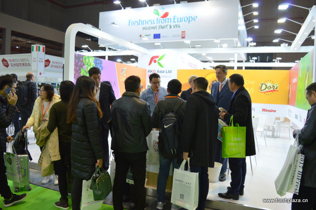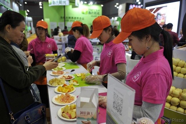People have gathered at the stand of RKG Asia to enquire about and taste the Dori, and Italian kiwifruit variety currently being exported to China // 人们聚集在 爱奇果园亚洲有限公司展台前询问有关Dori的信息并进行品尝,Dori 是目前出口到中国的意大利猕猴桃。