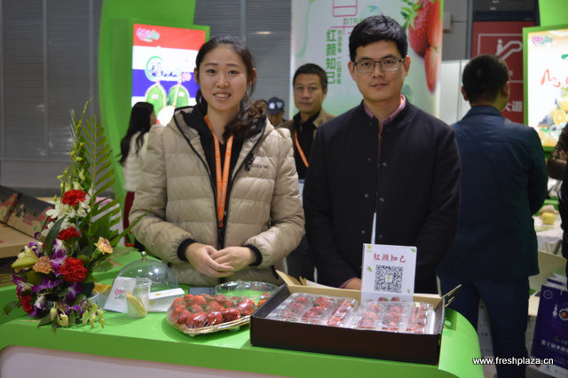 To the left is Chao Tong of Cat Fresh Fruit. The strawberries are grown in greenhouses and available all year around // 左边是喵果家人的童超。该公司的草莓生长在温室 里,全年都有供应