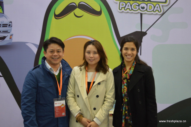 In the middle is Jade Shan of Mr Avocado, one of China's premium avocado brands, together with Jessica Delgado, sales rep at Frhomimex (Fruits and Vegetables from Mexico), shipper of Mexican avocadoes // 中间是牛油 果先生的Jade Shan,牛油果先生中国的优质牛油果品牌之一,与 Frhomimex (来自墨西哥的水果和蔬菜)的销售代表杰西卡一起, Frhomimex是墨西哥鳄梨托运商。