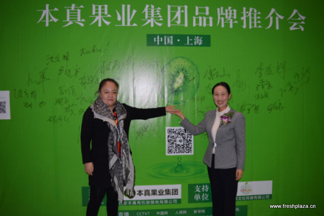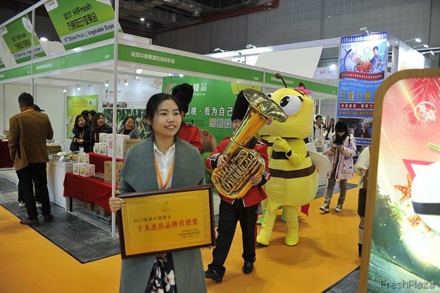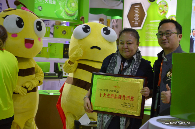Helen Gong, President of the Shaanxi Betrue Organic Fruit Industry Group is receiving a brand award for the company's BE TRUE organic kiwifruit brand. To the right is Zender, organisator of Hi Fresh // 陕西本真有机果业集 团的总裁宫妤,为其本真品牌接收品牌奖,右边是亚洲果蔬博览会的 组织者朱勇立
