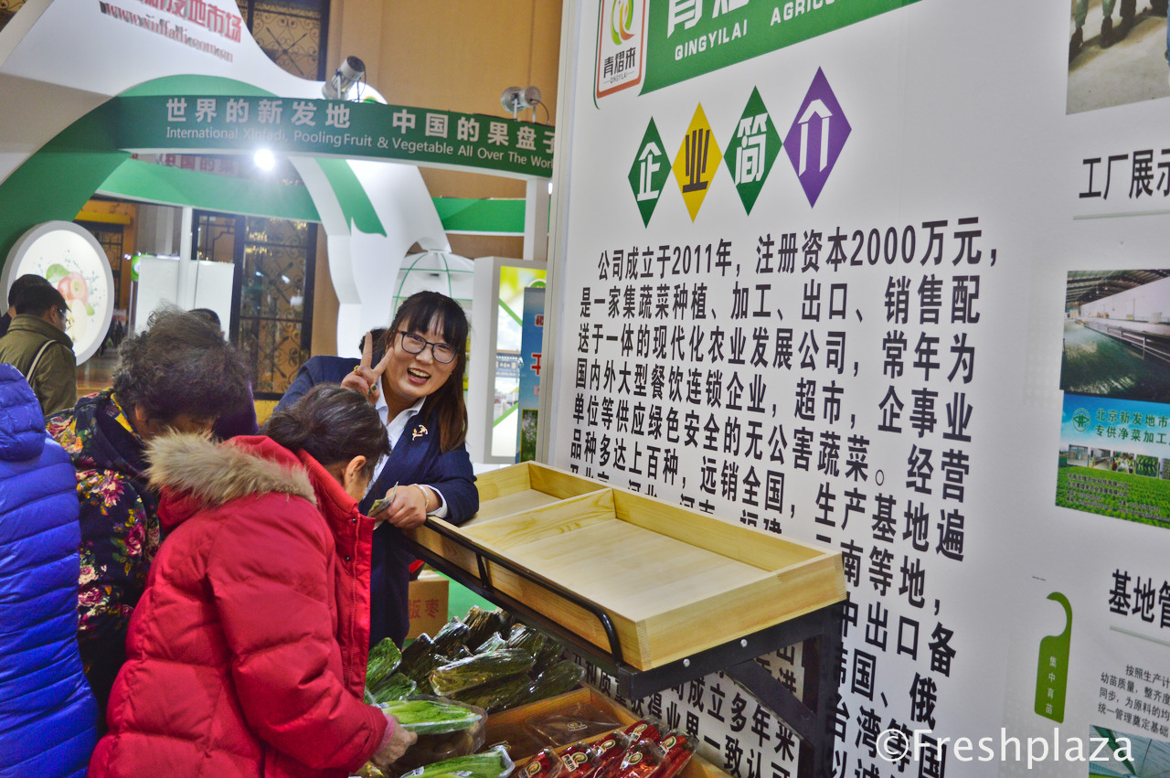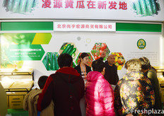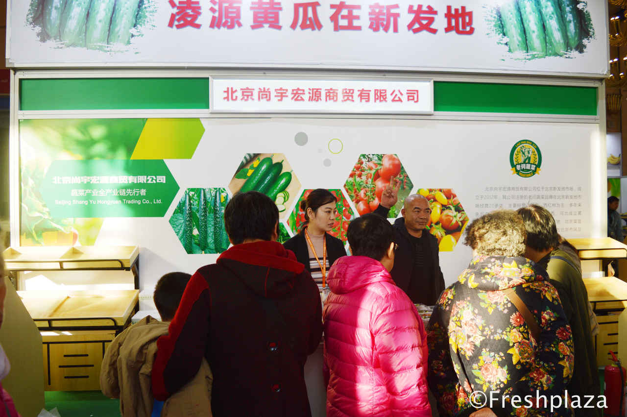 Yan Xueqiang from Lao Yan Shu Cai Vegetable sells different kind of vegetables. For examples, different tomato varieties and cucumber. These products are mainly produced in Shandong. // 来自北京尚宇宏源商贸有限公司的总经理闫学强,他们出售不同种类的蔬菜。例如,不同的番茄品种和黄瓜。这些产品主要是在山东生产的。
