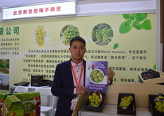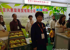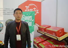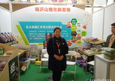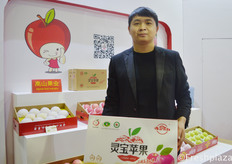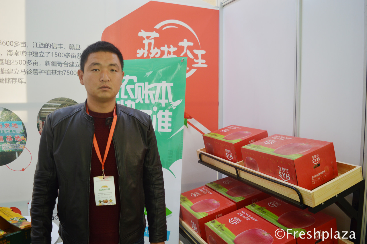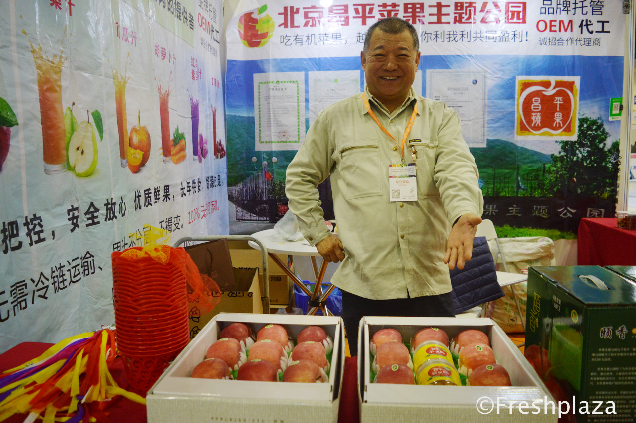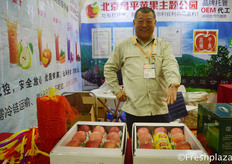 Shi Aijun from Beijing Baihuan Xiandai Nongye Company. They sell apples. // 来自北京百环现代农业有限公司的副总经理史爱军,他们销售苹果。