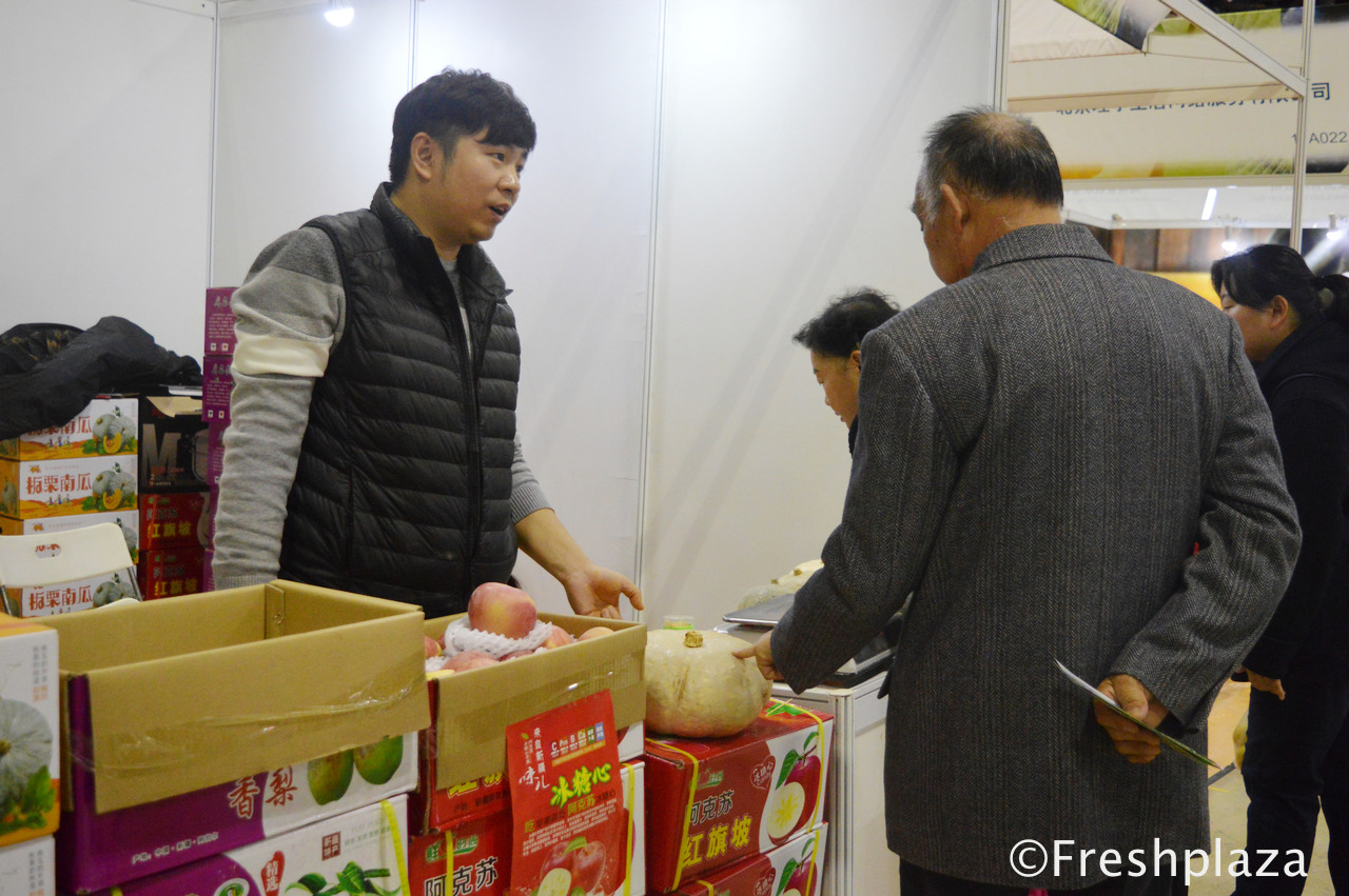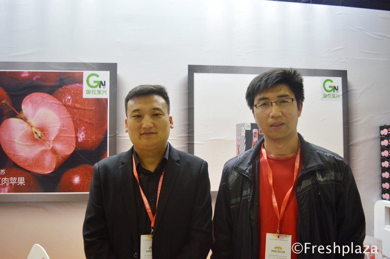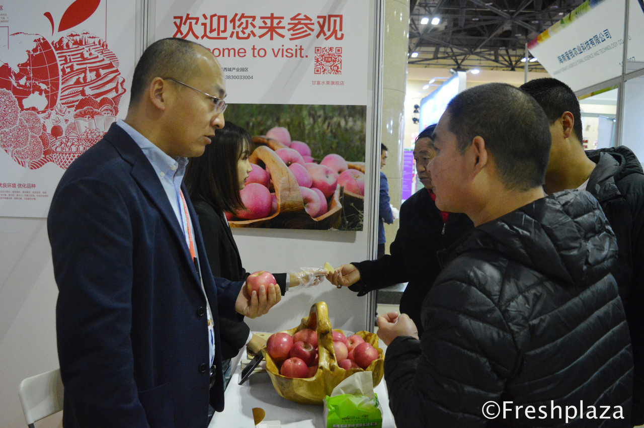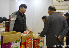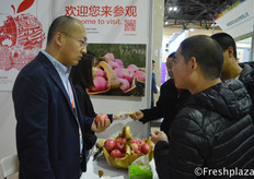 Mr. Zhang Long from Gansu Ganfu Guoye Jituan Company, discussing his 烟富10 apple with potential customers. Their Gansu apples are produced with organic fertilizer, which makes them organicly produced. // 来自甘肃甘富果业集团有限公司的运营部张龙,与潜在客户讨论他的烟富10苹果。他们的甘肃苹果是用有机肥料生产的,这使得它们可以在有机的方式下被生产。
