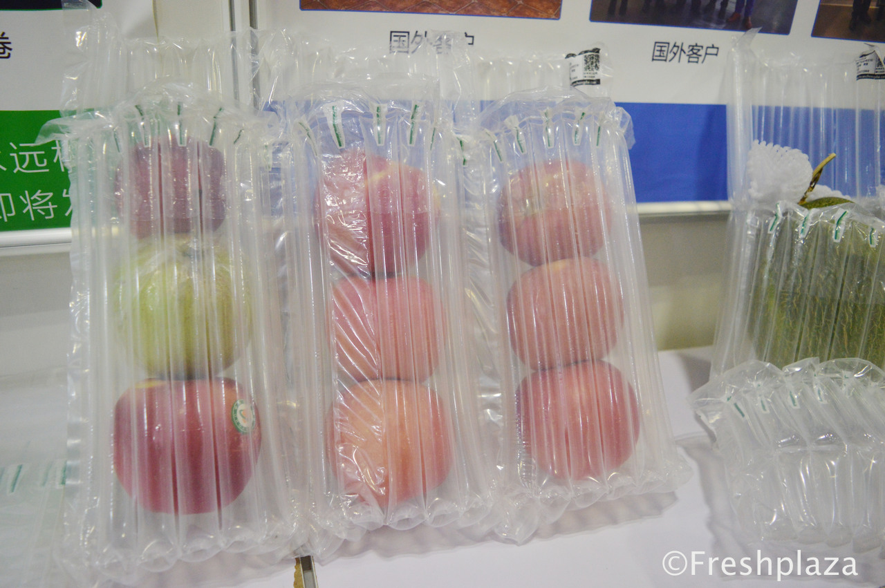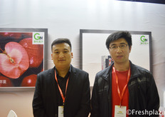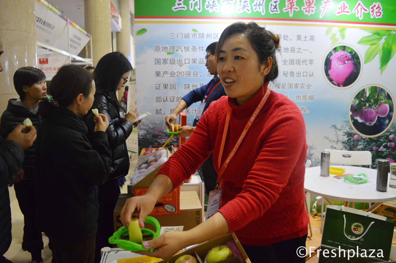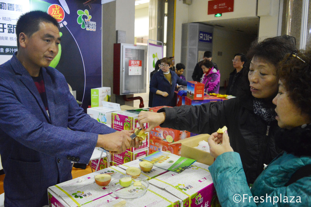Mr. Zhang Long from Gansu Ganfu Guoye Jituan Company, discussing his 烟富10 apple with potential customers. Their Gansu apples are produced with organic fertilizer, which makes them organicly produced. // 来自甘肃甘富果业集团有限公司的运营部张龙,与潜在客户讨论他的烟富10苹果。他们的甘肃苹果是用有机肥料生产的,这使得它们可以在有机的方式下被生产。