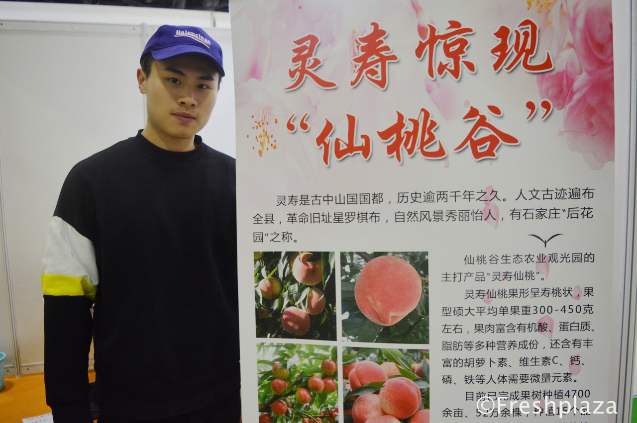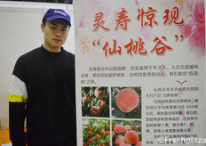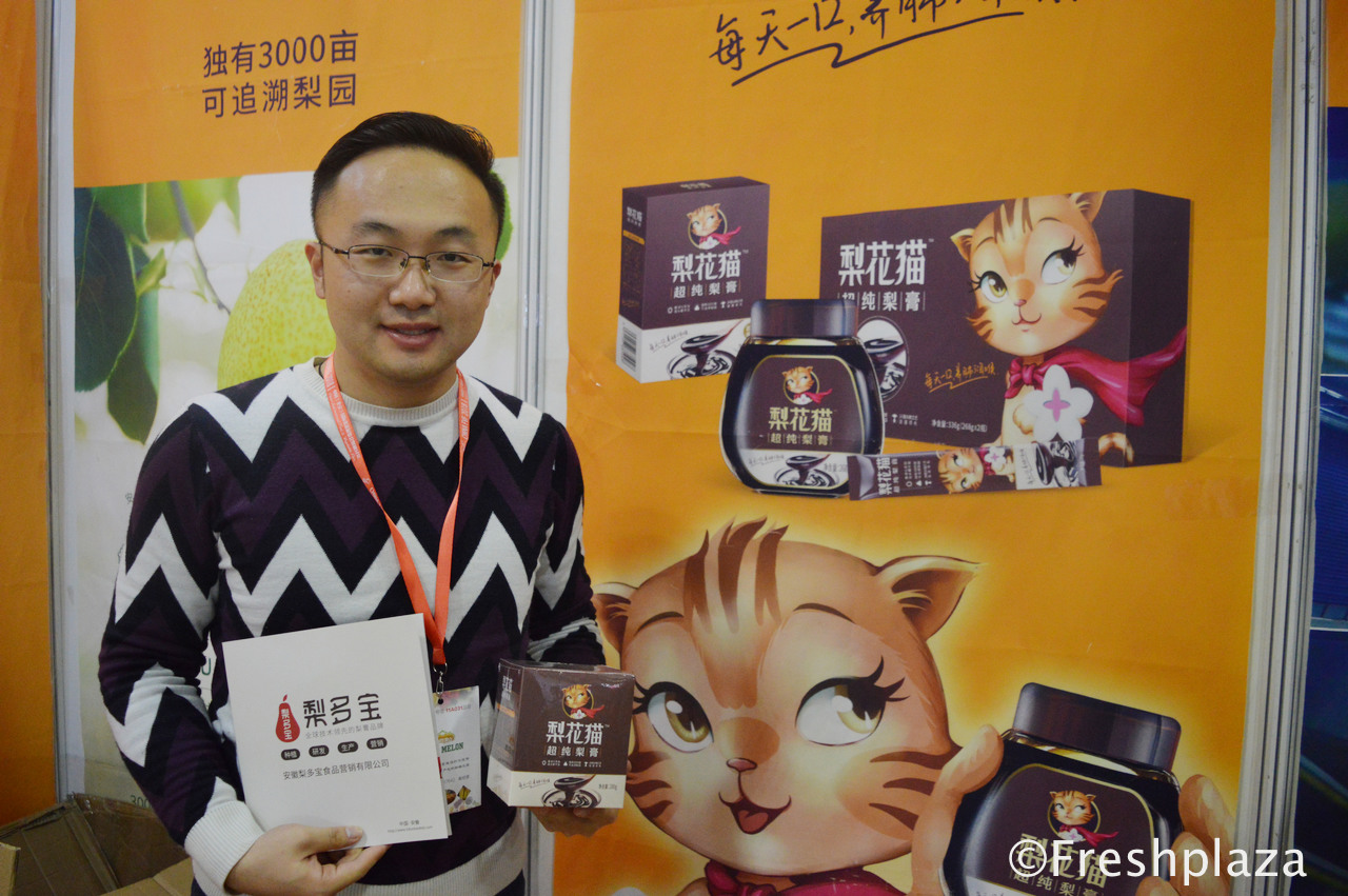 Jason from Li huamao. They sell pear syrup and also canned yellow peaches. Their pears are produced in Anhui and 30% is sold as fresh fruit and about 70% of the output is used to make pear syrup. // 来自安徽梨多宝食品营销有限公司的胡义杨,他们销售梨糖浆和罐装黄桃。他们的梨是在安徽生产的,30%作为新鲜水果出售,约70%的产量用来制作梨糖浆。