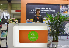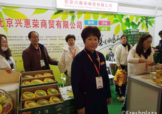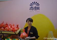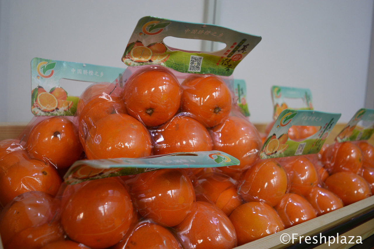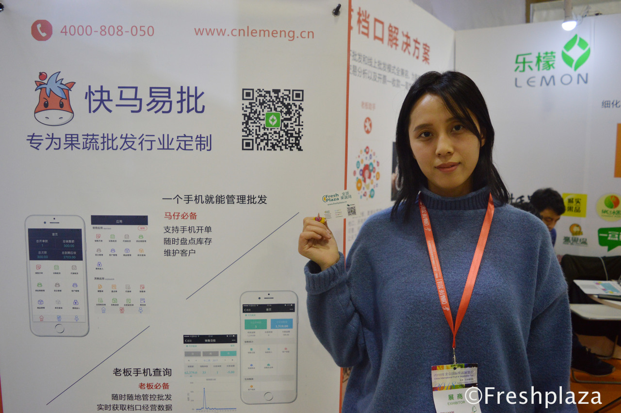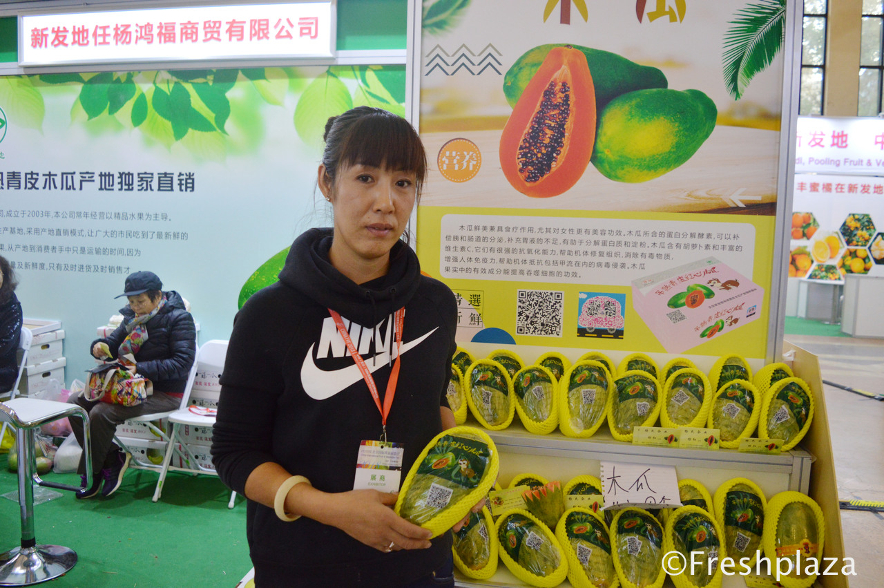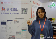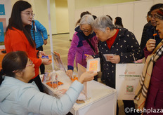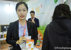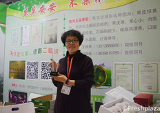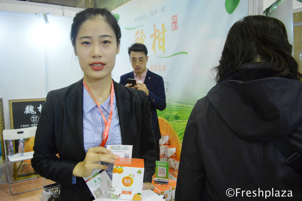 Becky from DD Agriculture, she shows the packaging with the Weys Citrus from Sichuan, Meishan. They had a good promotion strategy during this fair, everyone who scanned their wechat QR code could get a free citrus. They sell them in online stores, like Jingdong and their WeChat account. // 来自鼎德华夏农业科技集团的生鲜事业部销售经理纪金良,她展示了来自眉山四川的Weys柑橘包装。在这个交易会上,他们有一个很好的促销策略,即每个人扫描他们的微信QR码可以得到免费柑橘。他们在网上商店销售,比如京东和他们的微信账户。
