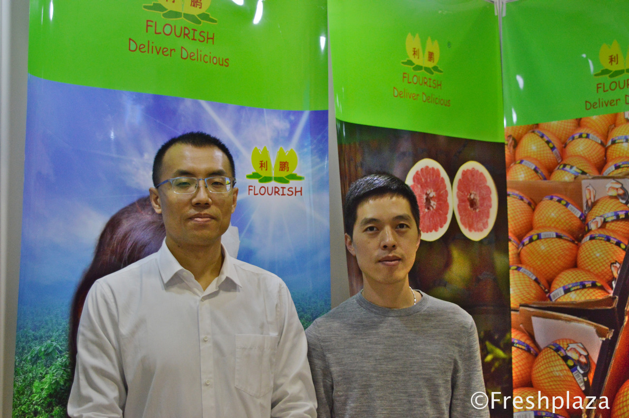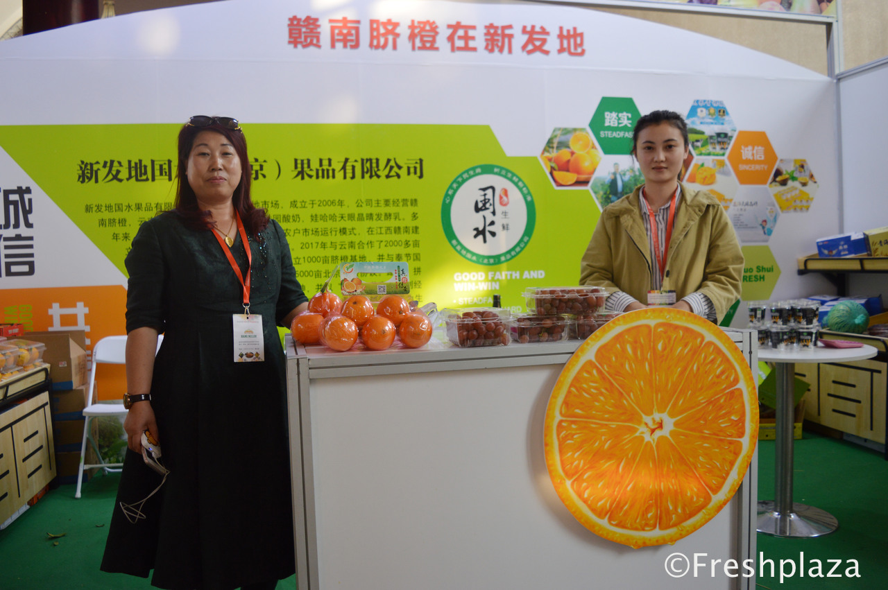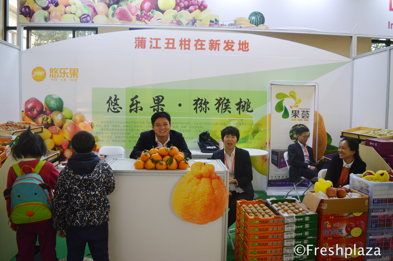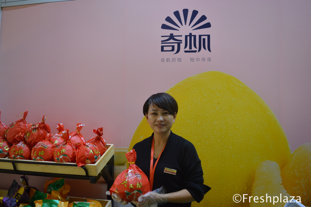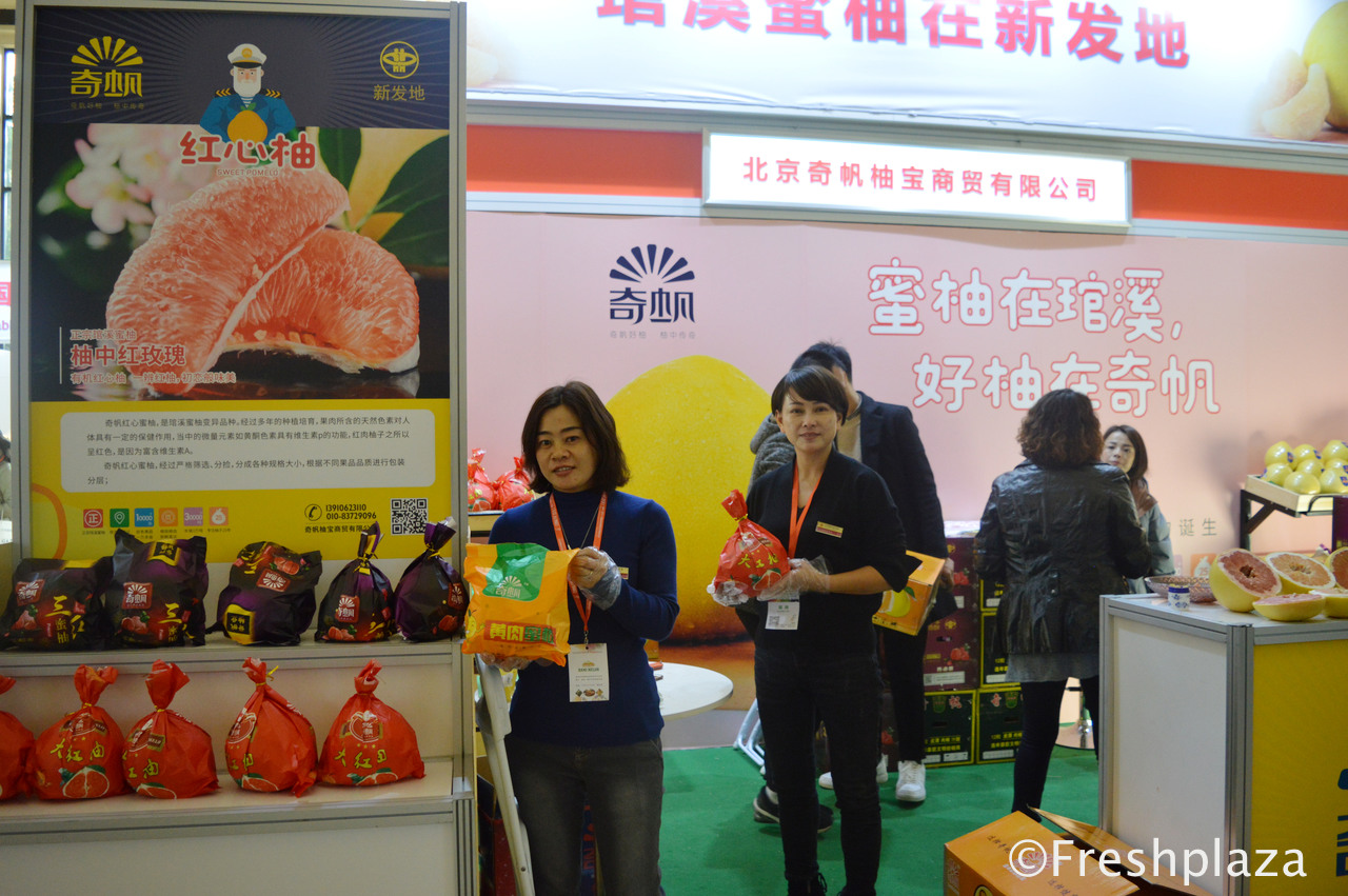 Beijing Qifan Youbao Shangmao Company, with their beautiful stand full with Fujian pomelos. // 北京奇帆柚宝商贸有限公司,他们漂亮的展位摆满了福建柚子。