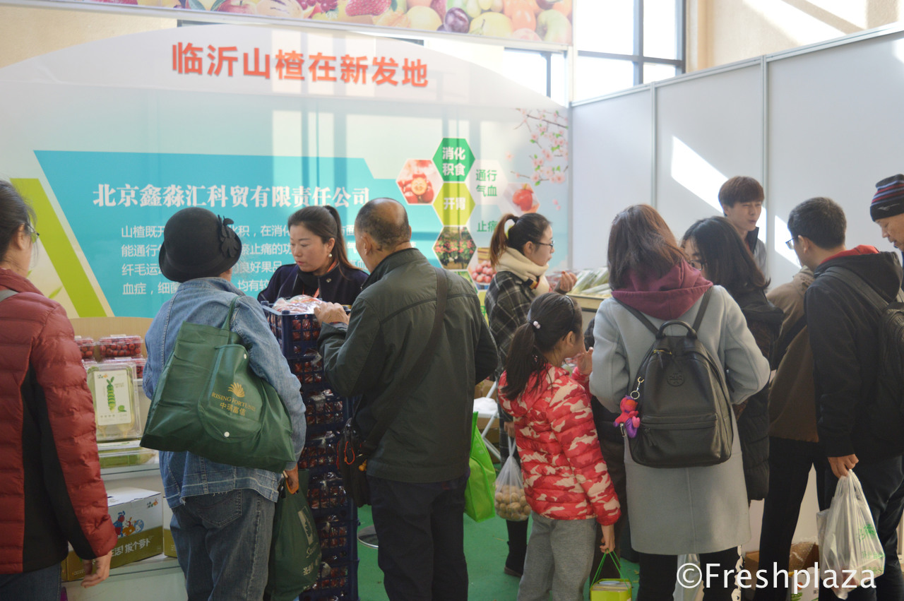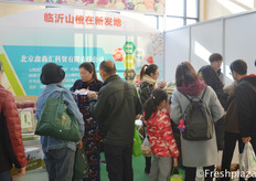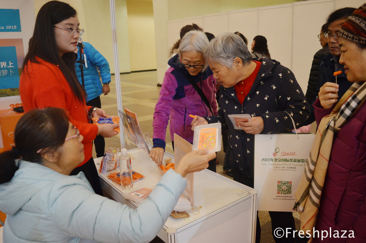 A lot of interested people for the baby carrot at the Directa Co., Ltd. Booth. // 许多对迷你胡萝感兴趣的人在北京直达农业科技有限公司展位前