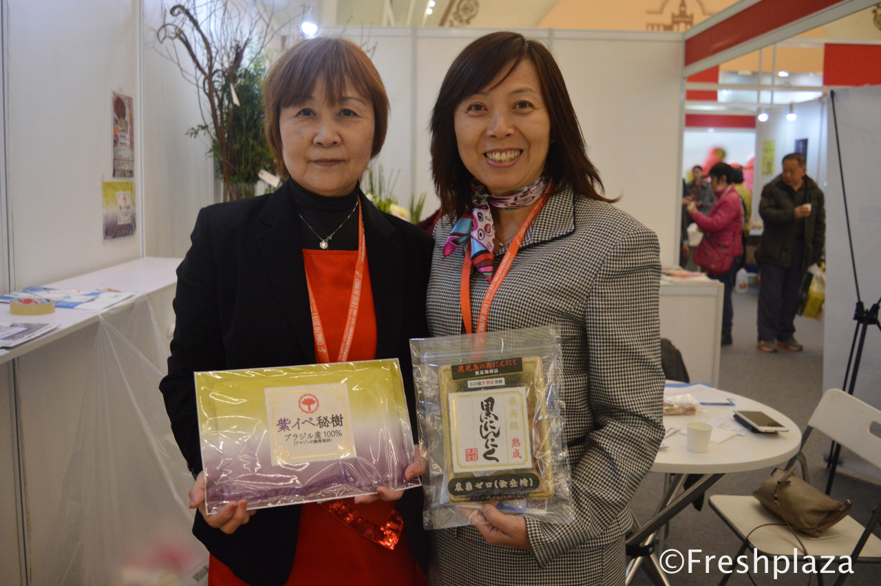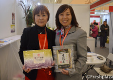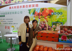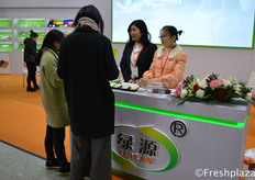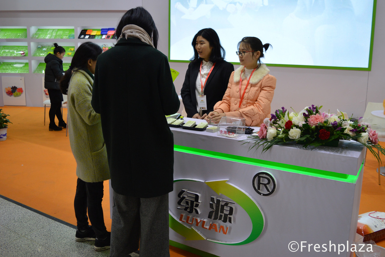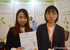 Suzy Lee (left) and her colleague from Shenzhen Lvyuan Packaging Technology CO.,LTD. They are specialized in all kind of packaging, for example seasonal fruits, vegetables, seafood, snack foods etc. // 深圳市绿源包装科技有限公司的李佳萍和她的同事,该公司专业生产各种包装,如季节性水果、蔬菜、海鲜、快餐食品等。