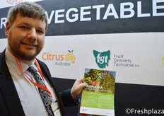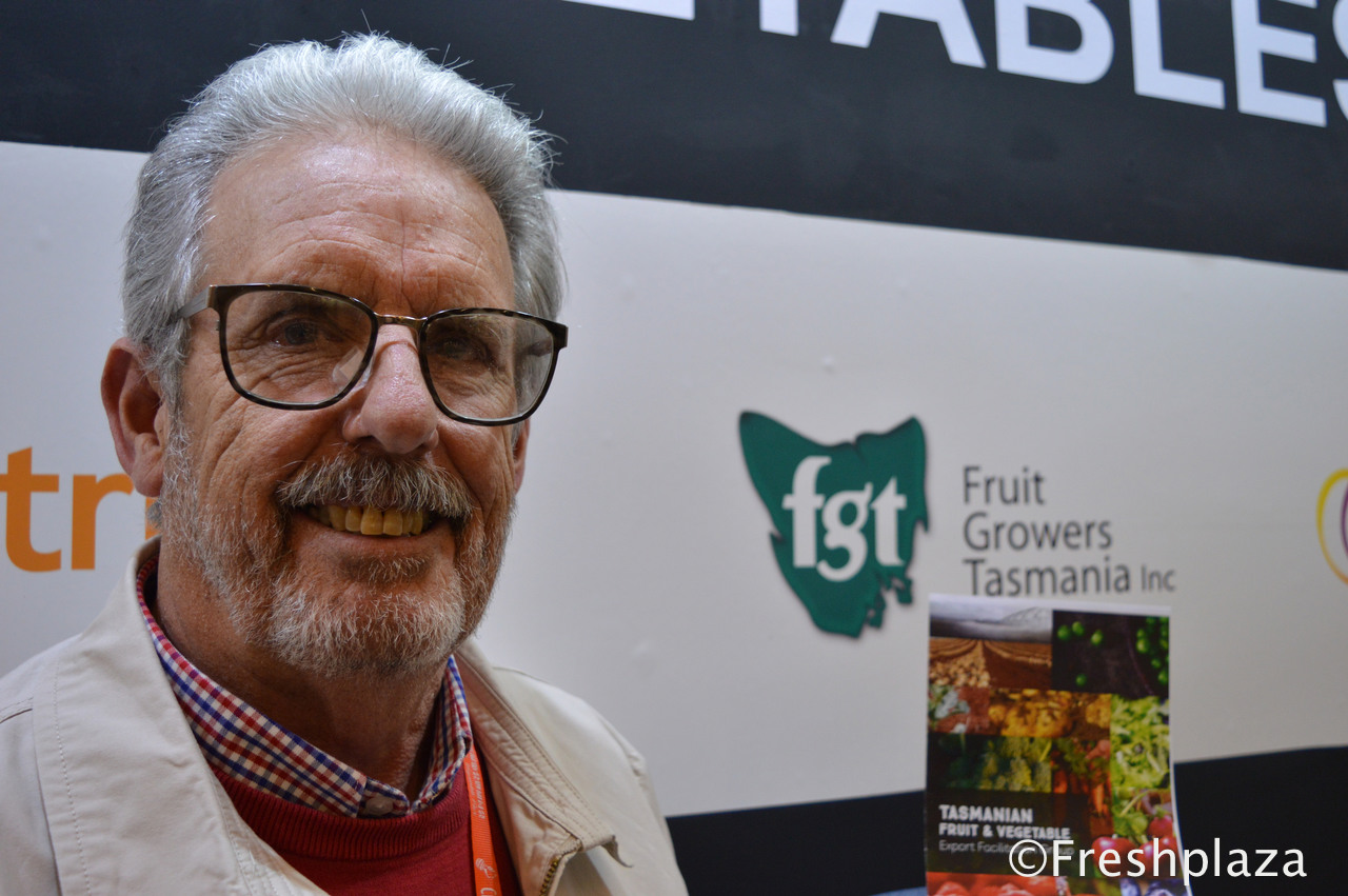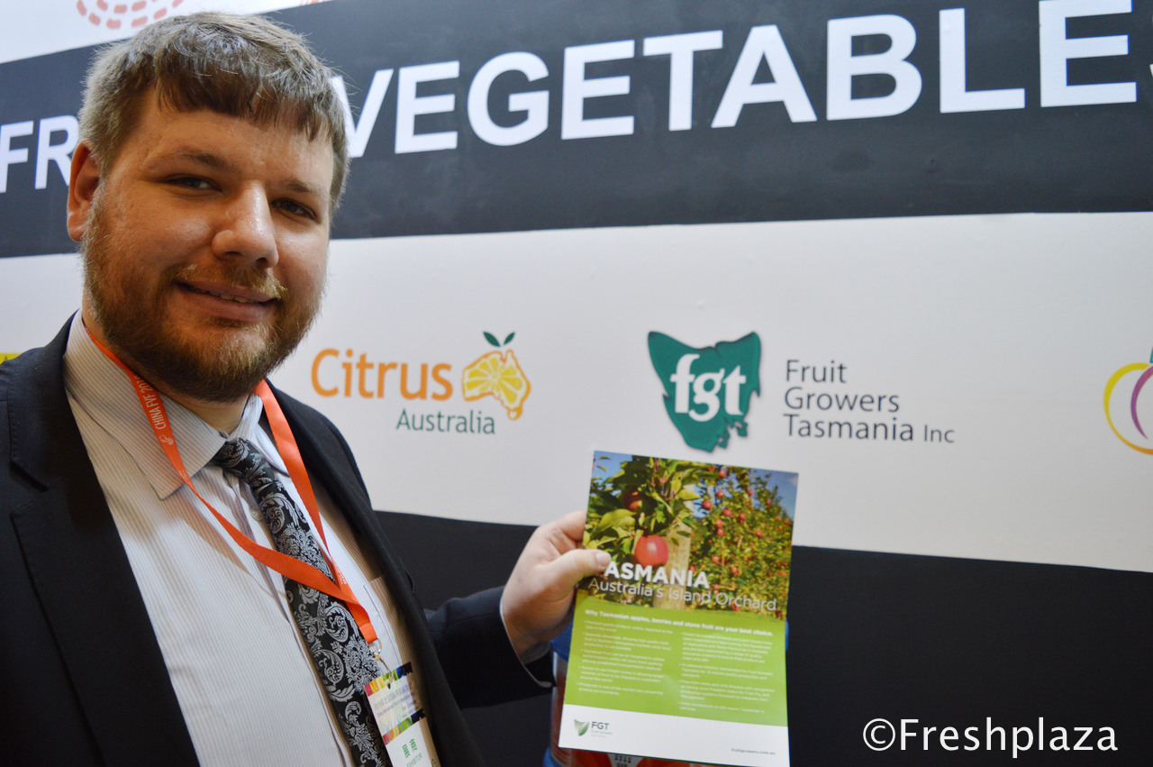 Ian Locke from Fruit Growers Tasmania (FGT). They export a lot of Tasmanian fruits to China, for example cherries. Their cherries can directly be exported to China by air, no fumigation is needed. // 来自塔斯马尼亚水果种植商协会(FGT)的Ian Cover。他们向中国出口许多塔斯马尼亚水果,例如樱桃。他们的樱桃可以直接被空运到中国,不需要经过熏蒸。