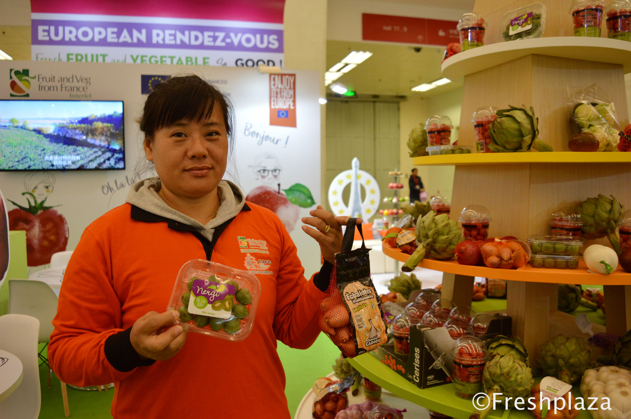 The French Agriculture and Food Council (CAFC), they showed a lot of interesting French products at their booth, such as kiwi berries, shallots, garlic, tomatoes, artichoke, apples etc. All from French. // 法国农业食品委员会CAFC,他们在摊位上展出了许多有趣的法国产品,如猕猴桃浆果、小葱、大蒜、西红柿、朝鲜蓟、苹果等。
