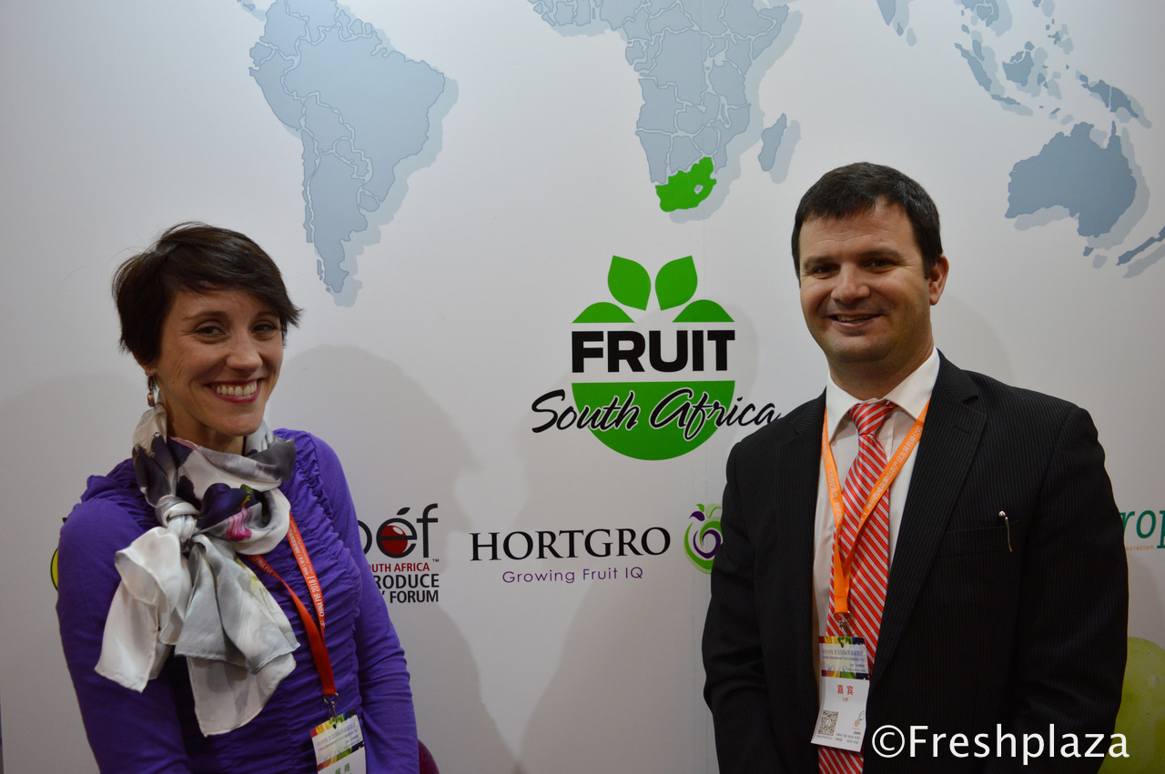 HORTGRO Elzette Schutte and Jaques du Prez from HORTGRO. They would like to export their blueberries to China, though there is no access yet. The blueberry industry in South Africa is fast developing, it is good for the economy and could benefit to decrease the unemployment. They now already export to the UK, Europe, Middle East, Hong Kong and America. // 来自HORTGRO的Elzette Schutte和同事。他们想把蓝莓出口到中国,尽管还没有获得准入权。南非蓝莓产业发展迅速,这有利于经济发展,以及减少失业。他们现在已经出口到英国、欧洲、中东、香港和美国。