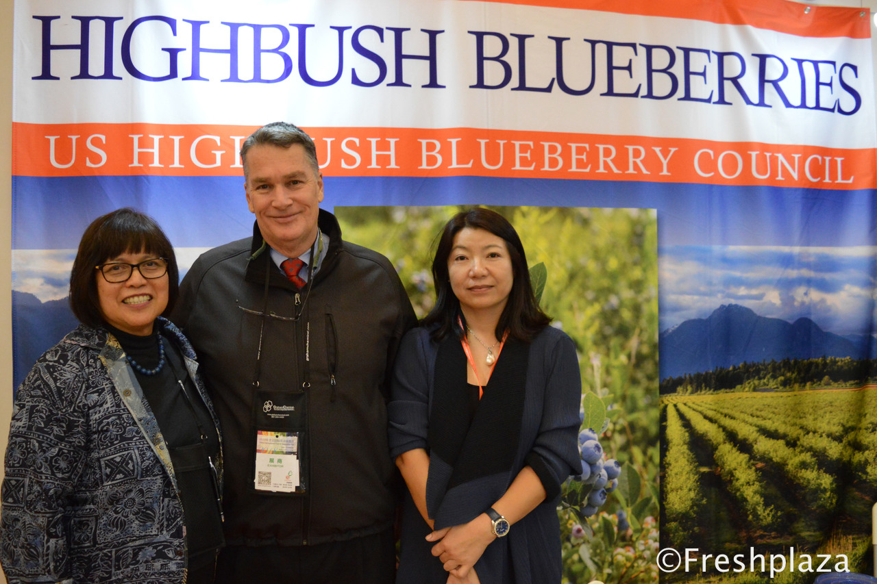Team from US Highbush Blueberry Council. They represent all blueberry growers in the US. Frozen and dried blueberries are allowed to enter China, they hope that fresh blueberries will also be allowed soon.// 美国高丛蓝莓协会的团队他们代表了美国所有的蓝莓种植者。冷冻和被晒干的蓝莓被允许进入中国,他们希望新鲜蓝莓也将很快被允许进入中国。