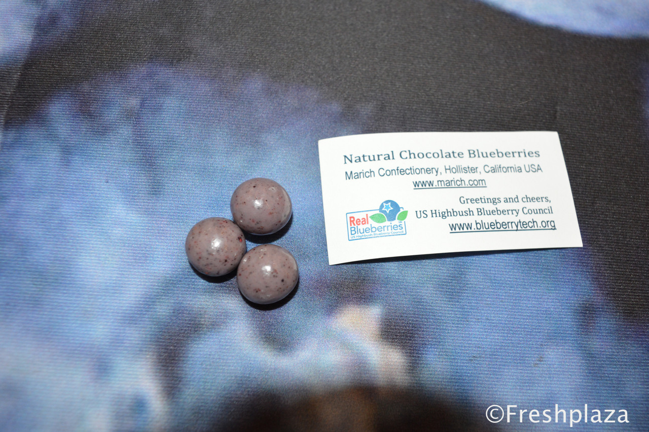 Chocolate with blueberry filling from US Highbush Blueberry Council.// 美国高地灌木蓝莓理事会的含有蓝莓的巧克力。