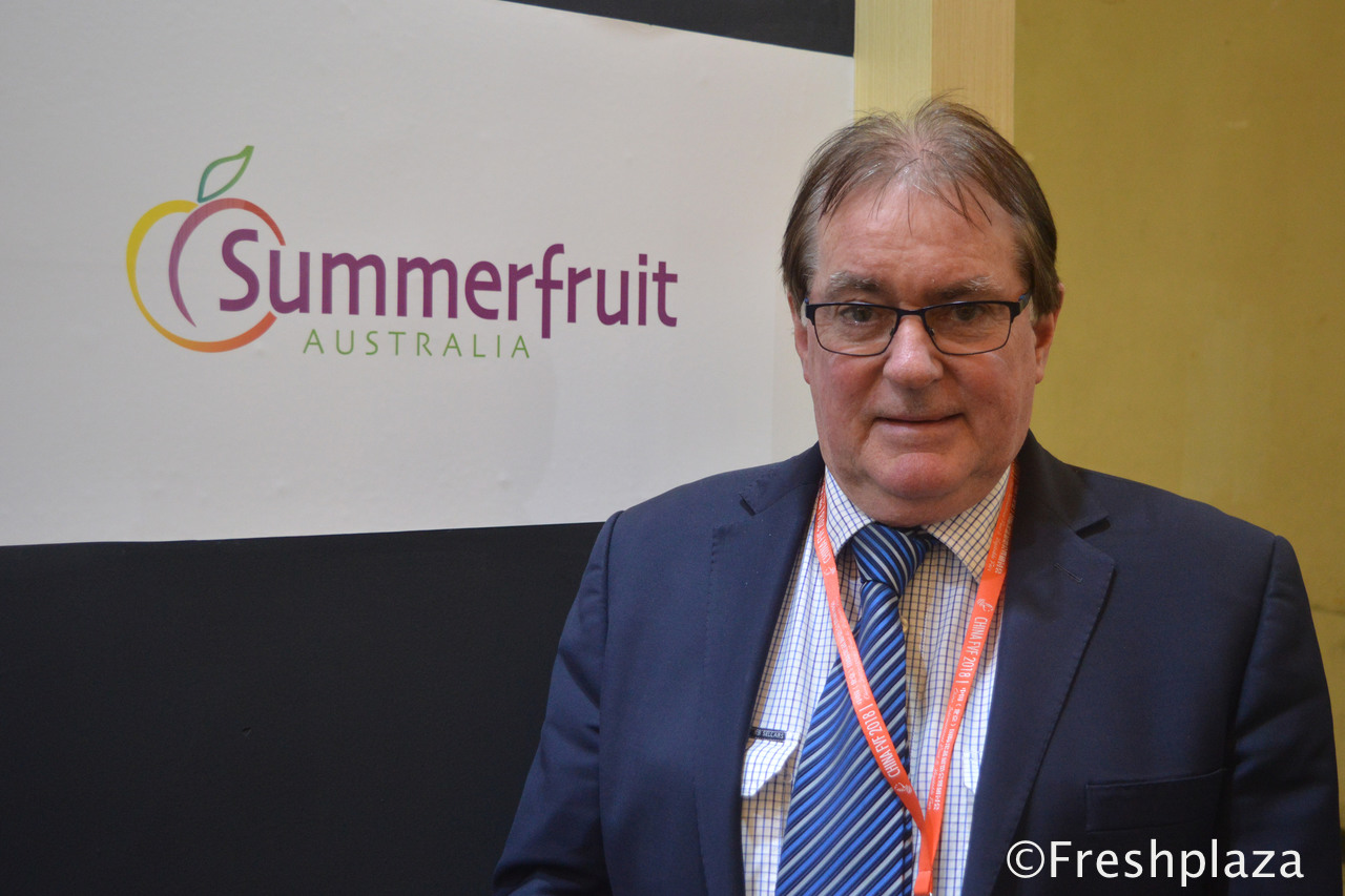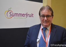 John Moore from Summerfruit Australia. They export apricot, peach, plum and nectarine from Australia. Their top three export countries are China, Middle East and Singapore. // 澳大利亚夏果类商团的行政总裁莫约翰。他们从澳大利亚出口杏、桃、李子和油桃。他们的前三个出口国家是中国、中东和新加坡。