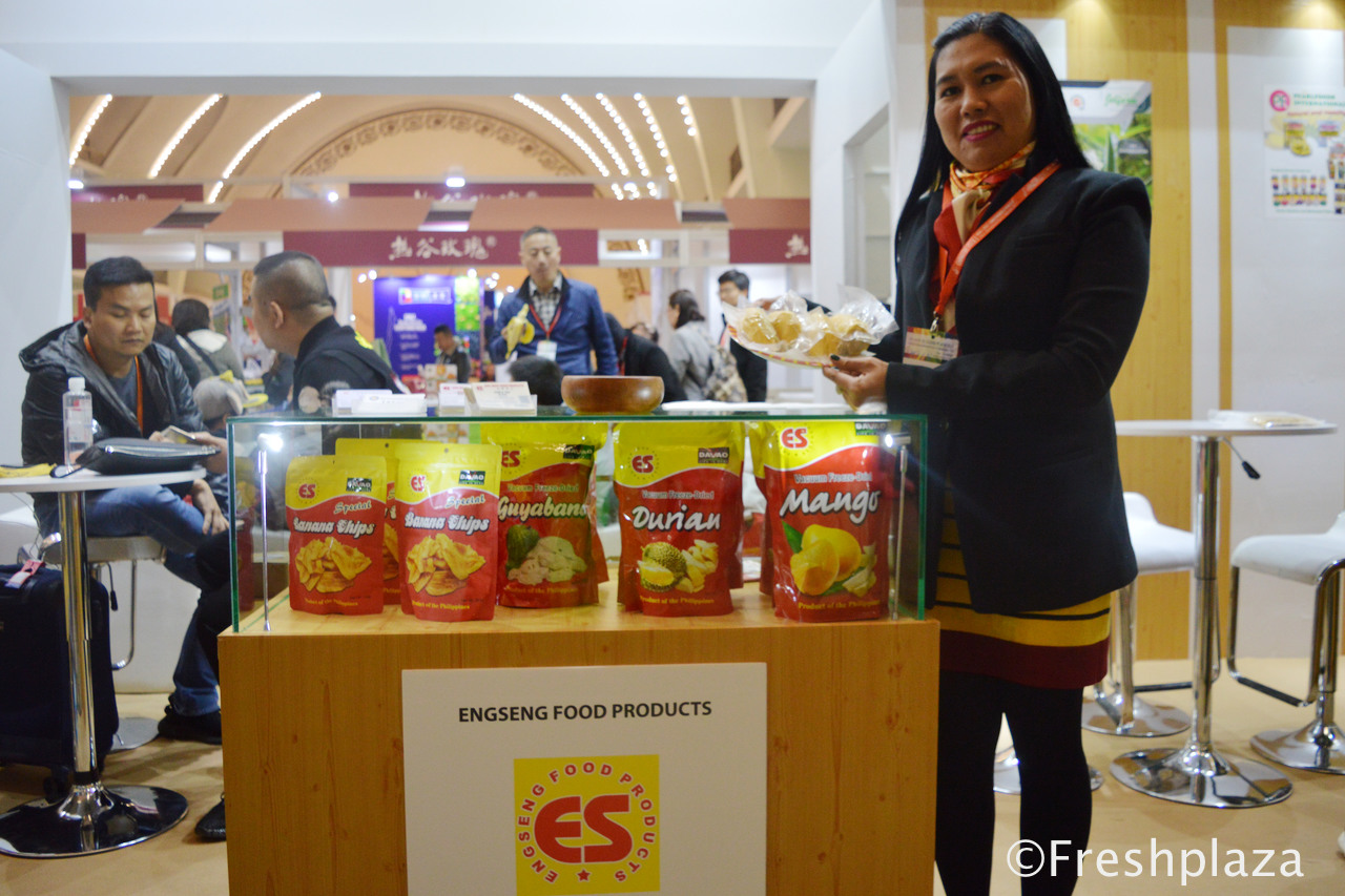 Jean Mendoza from Eng Send Food Products, they sell vacuum freeze dried mango, guyabana, durian and banana chips. // 来自Eng Send Food Products的Jean Mendoza,他们出售真空冷冻干燥芒果,榴莲和香蕉片。