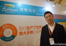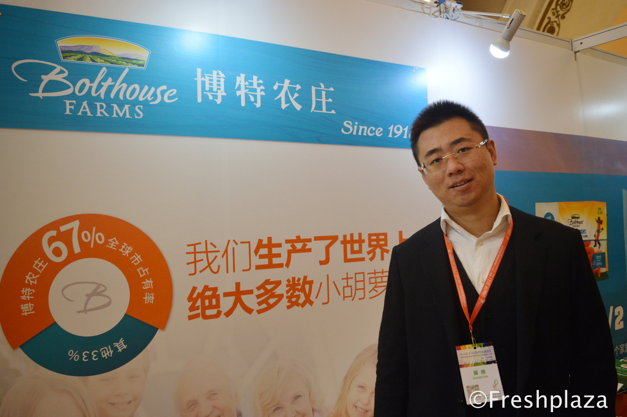 Chun Wang from Directa Co., Ltd., who sell baby carrots from Bolthouse Farms, the largest producer of baby carrots. Besides this product, they also sell fruit and vegetable juices and cheese. // 北京直达农业科技有限公司的首席执行官王淳。他出售来自最大的胡萝卜生产商Bolthouse Farms的迷你胡萝卜。除了这个产品,他们还销售水果,蔬菜汁和奶酪。
