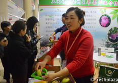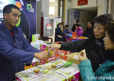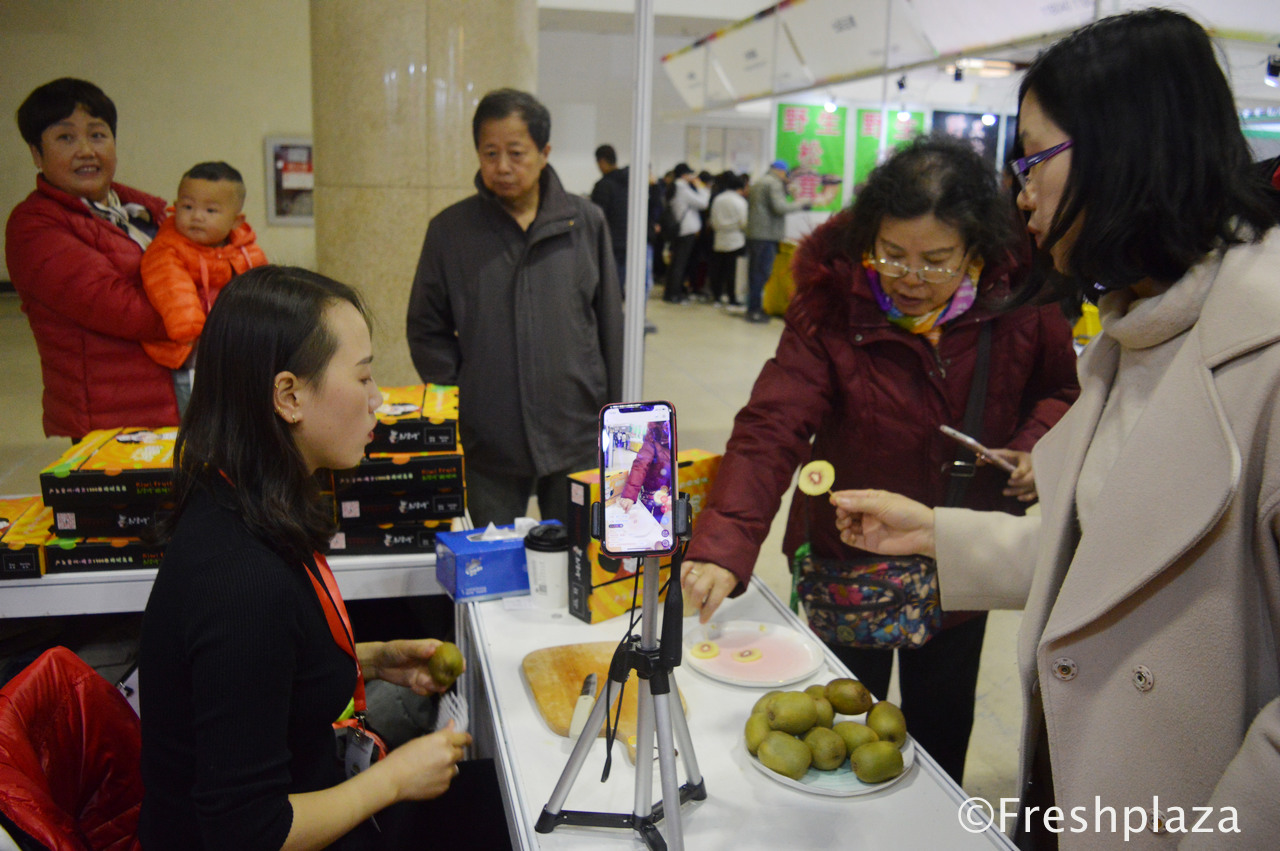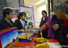 Visitors tasting the Red hearted kiwi fruit from Shanghai Yi Kailong Network Technology Co. Ltd. // 访客品尝上海益凯龙网络科技有限公司的红心猕猴桃。