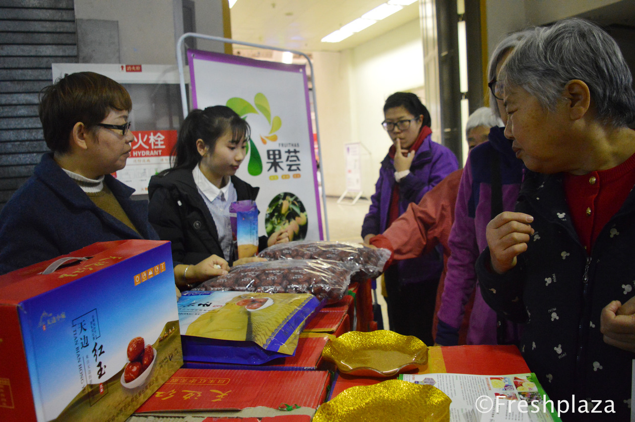 Busy at the booth of the Xinjiang fruits, Tianbian Xiaowan. // 繁忙的新疆天边小宛农业科技股份有限公司展位