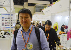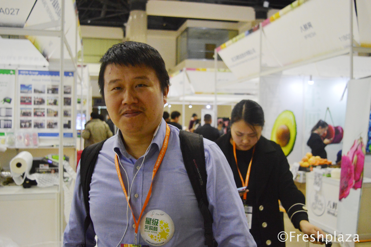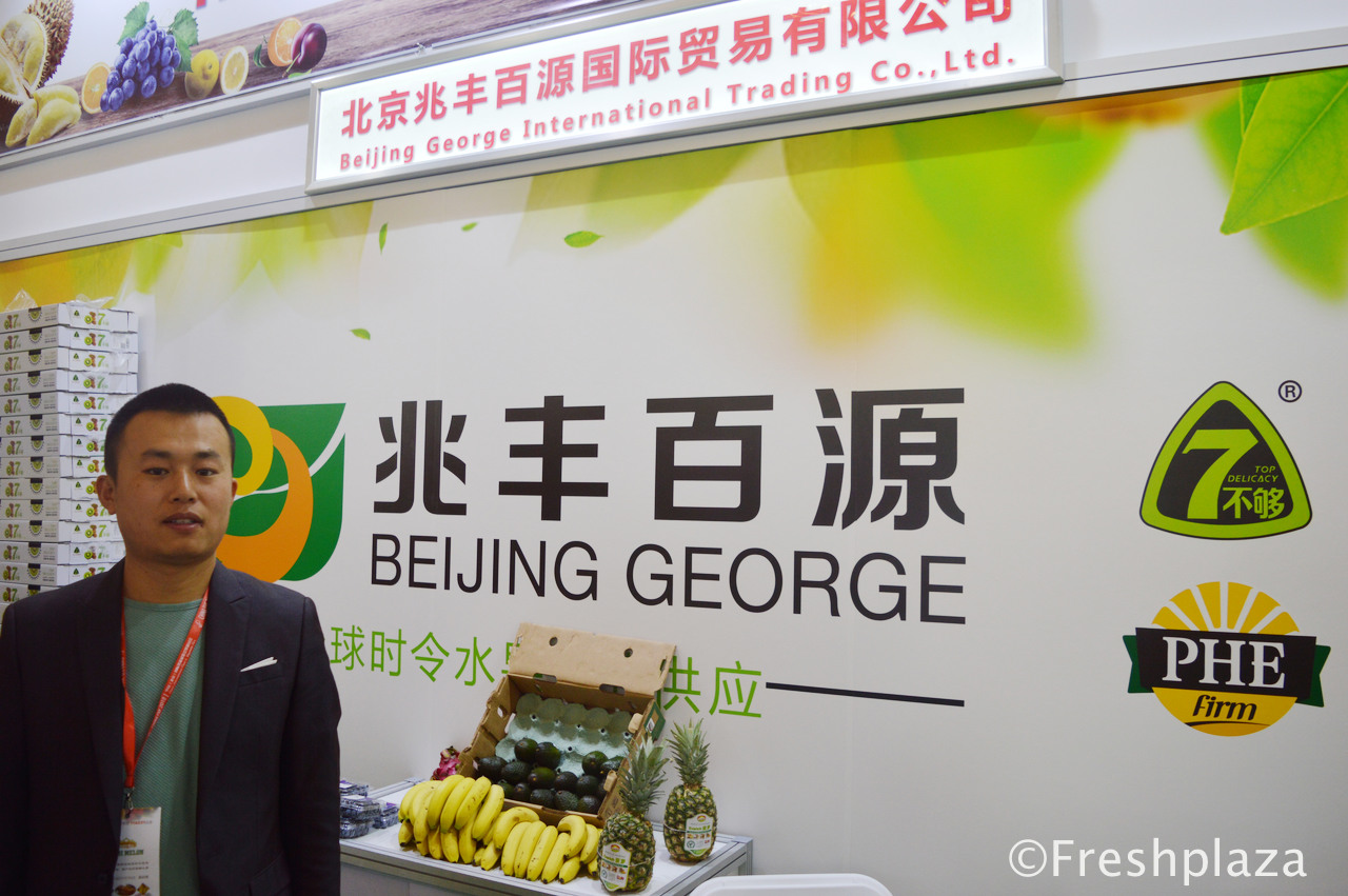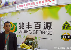 Victor Shi from Beijing George International Trade Co., Ltd. Selling all different kiwi fruit brands, pineapples, bananas etc. // 来自北京兆丰百源国际贸易有限公司的外贸部总经理助理石文元,该公司出售各种不同的猕猴桃品牌,菠萝,香蕉等。