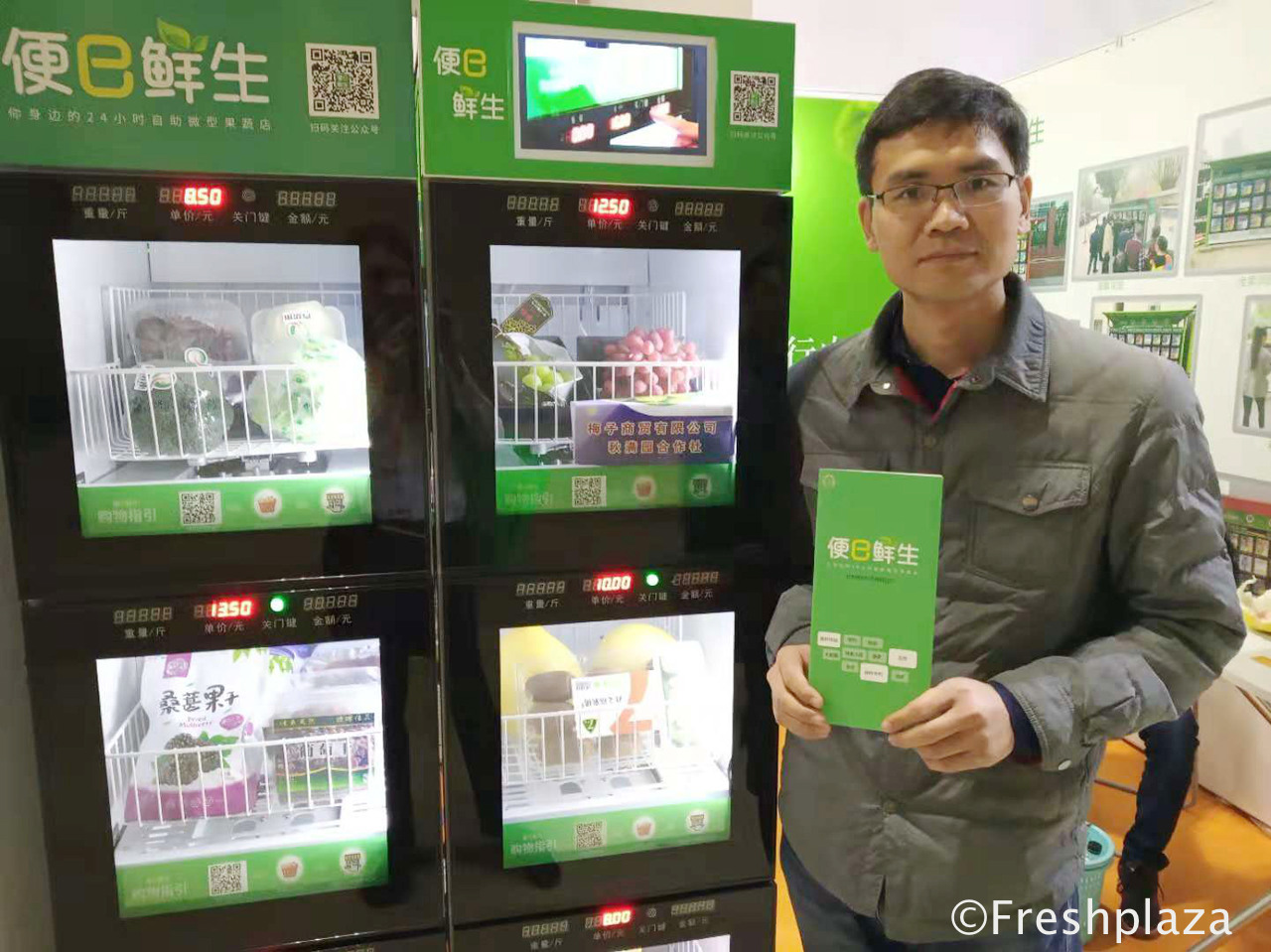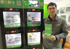 Guan Luanjun from Bian e xiansheng. He provides the 24h selfserive fruit and vegetable vending machine. You can scan a QR code to open it, take something out and pay directly. It weighs automatically how much you took out of the machine. // 来自北京阔安科技有限公司的管銮军。