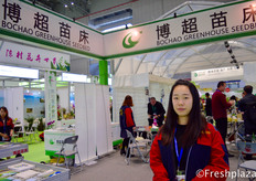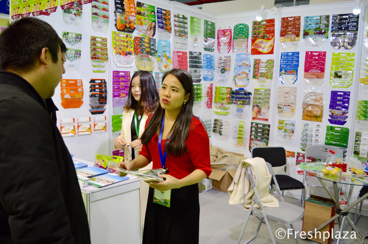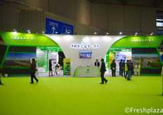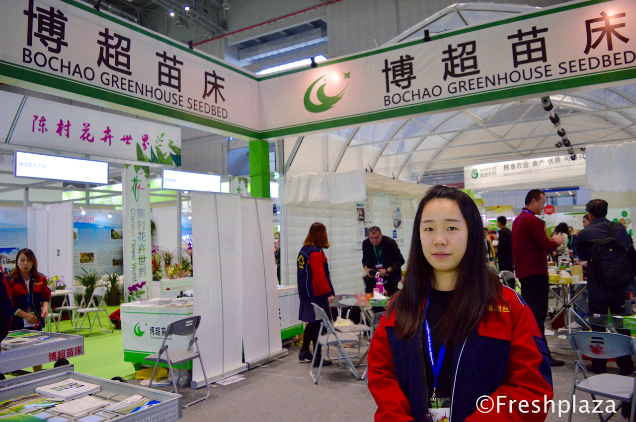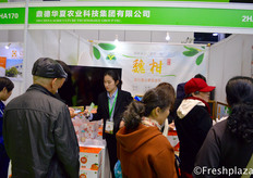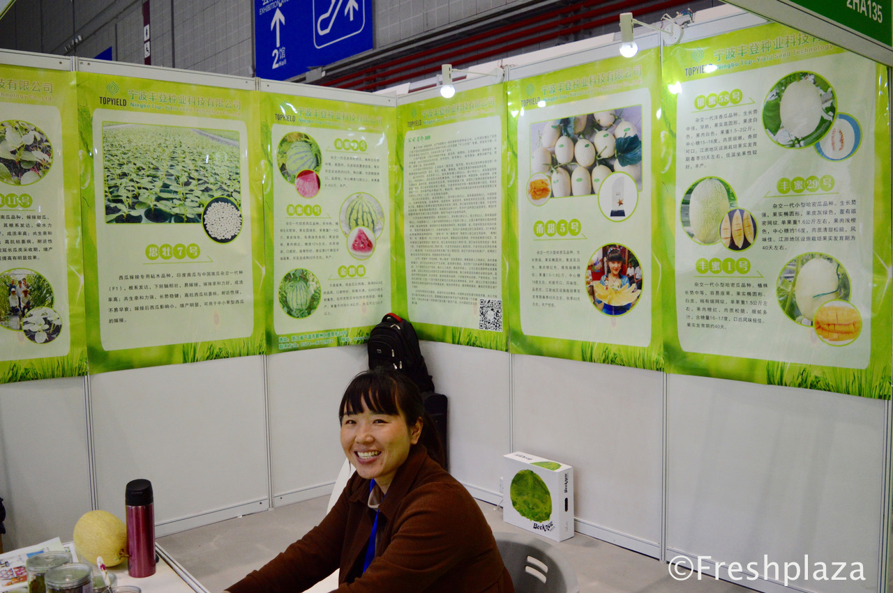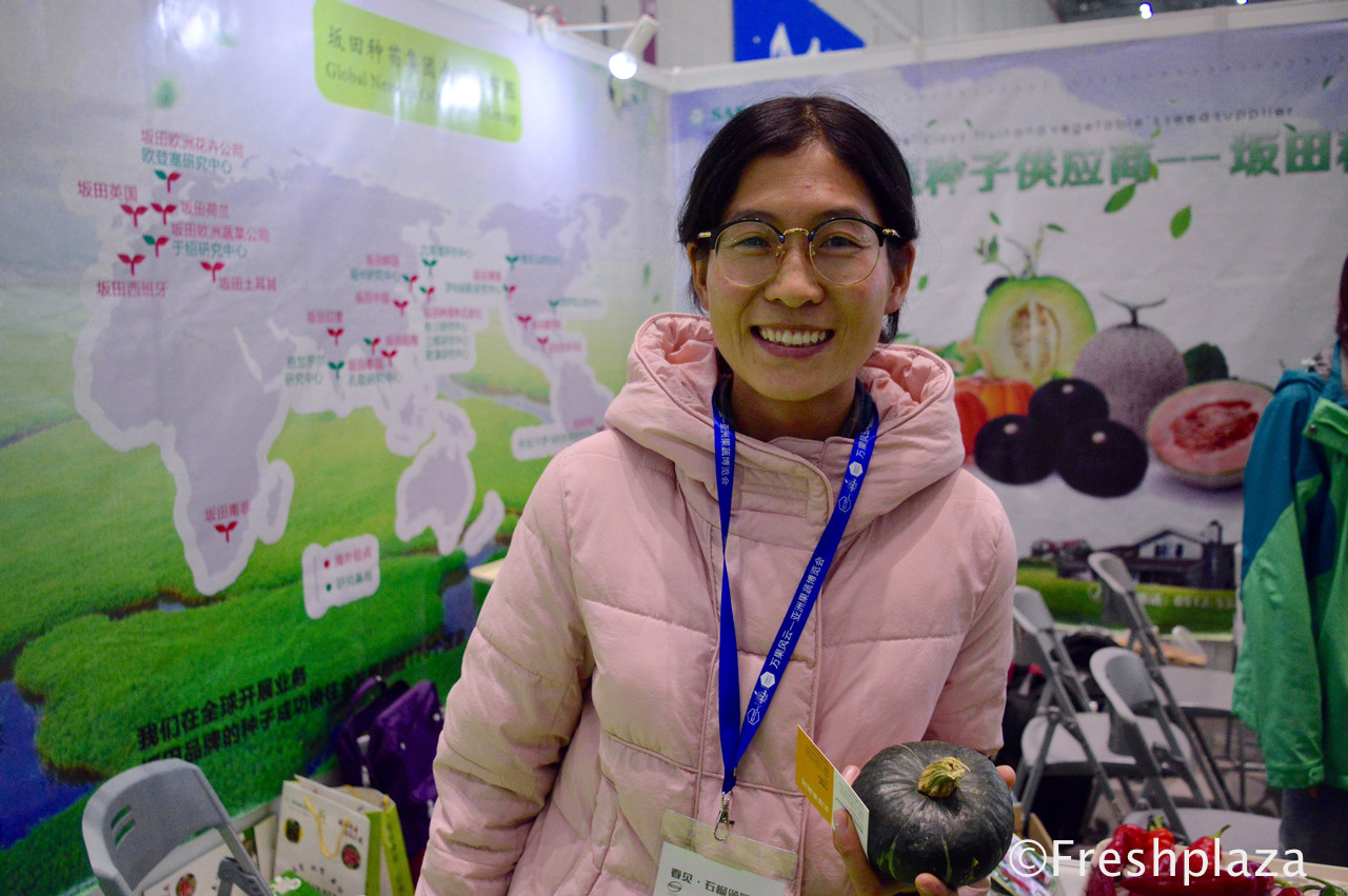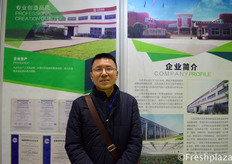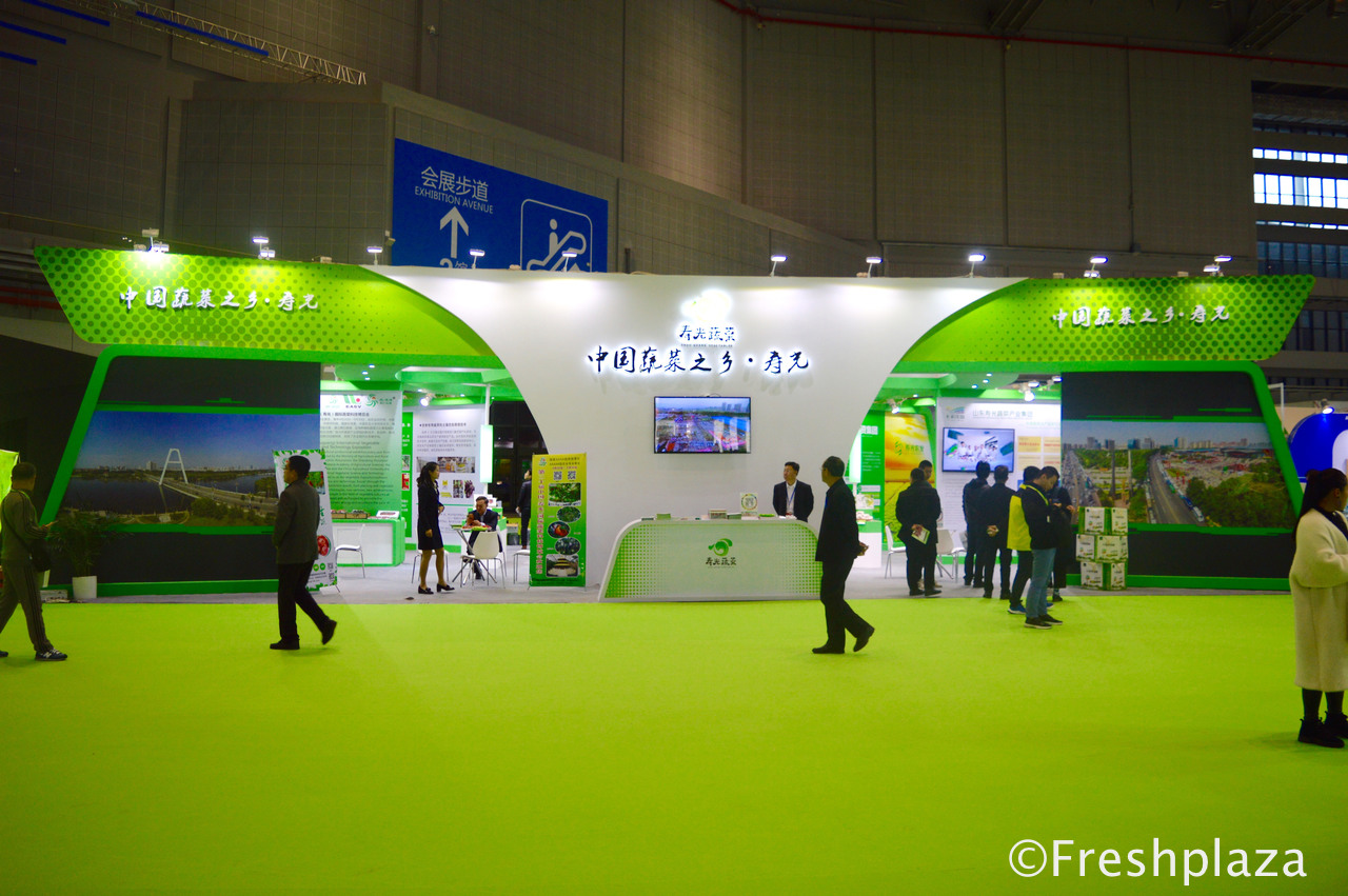 The large booth of Shandong Shouguang Vegetable Industry Group Co., Ltd with Mr. Zhang Qinghu. They are specialised in vegetables, they control the whole chain, from seedling to selling and distributing on the wholesale market. // 山东寿光蔬菜产业集团有限公司的大型展位以及该公司的张清虎。他们专门从事蔬菜运营,控制整个产业链的运作,从批发市场上的幼苗销售到分销。